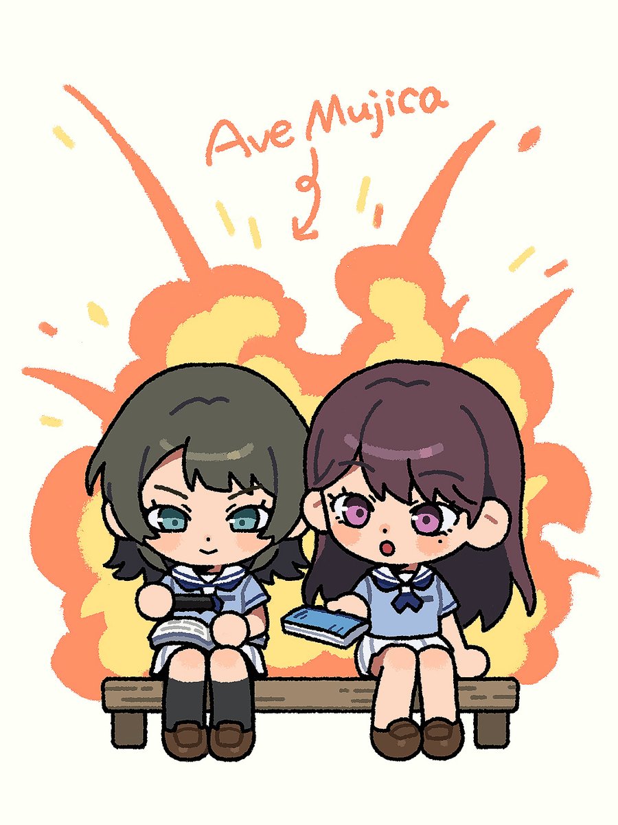 2girls bang_dream! bang_dream!_it's_mygo!!!!! black_hair black_socks blue_neckerchief blue_shirt brown_footwear cellphone chibi chibi_only chinese_commentary closed_mouth commentary_request explosion explosion_background hanasakigawa_school_uniform highres holding holding_phone kneehighs loafers long_hair medium_hair mole mole_under_eye multiple_girls neckerchief open_mouth phone pleated_skirt purple_eyes purple_hair sailor_collar school_uniform serafuku shao_(shaorouhong) shiina_taki shirt shoes short_sleeves skirt smartphone socks taking_picture white_sailor_collar white_skirt yahata_umiri