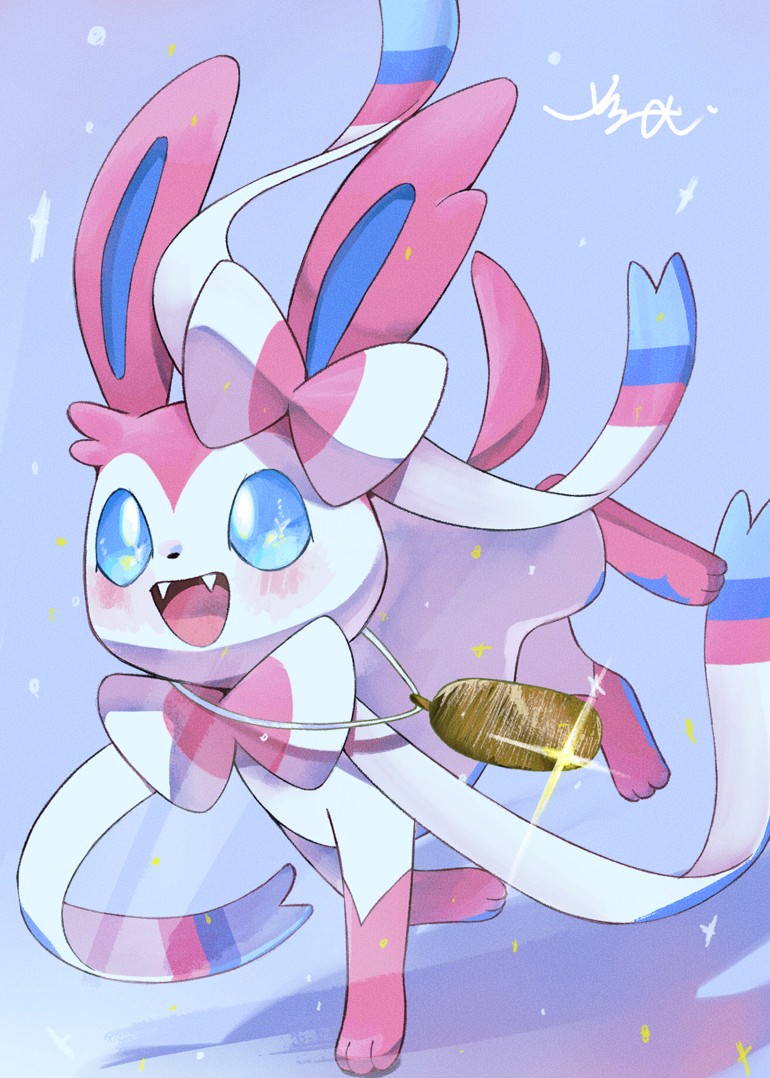 animal_focus blue_eyes blush bow commentary_request fangs gen_6_pokemon highres jewelry necklace nintendo no_humans open_mouth pokemon pokemon_(creature) shadow simple_background smile surumeika_(ninfiiiir) sylveon walking