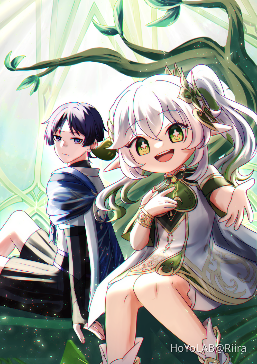 1boy 1girl anklet arm_at_side armlet black_bodysuit black_bridal_gauntlets black_shorts bloomers blue_cape blunt_ends bodysuit bracelet bridal_gauntlets cape closed_mouth detached_sleeves dome dress fingernails genshin_impact gold gold_trim green_eyes green_hair hair_ornament hakama hakama_shorts hand_on_own_chest highres hoyolab_username japanese_clothes jewelry kimono knees_together_feet_apart leaf leaf_hair_ornament long_hair looking_at_viewer multicolored_hair nahida_(genshin_impact) open_hand open_mouth pleated_shorts pointy_ears purple_eyes purple_hair rixira_(234416714) scaramouche_(genshin_impact) shorts side_ponytail sidelocks sitting streaked_hair teeth tongue tree underwear upper_teeth_only wanderer_(genshin_impact) white_bloomers white_dress white_footwear white_hair white_kimono white_trim
