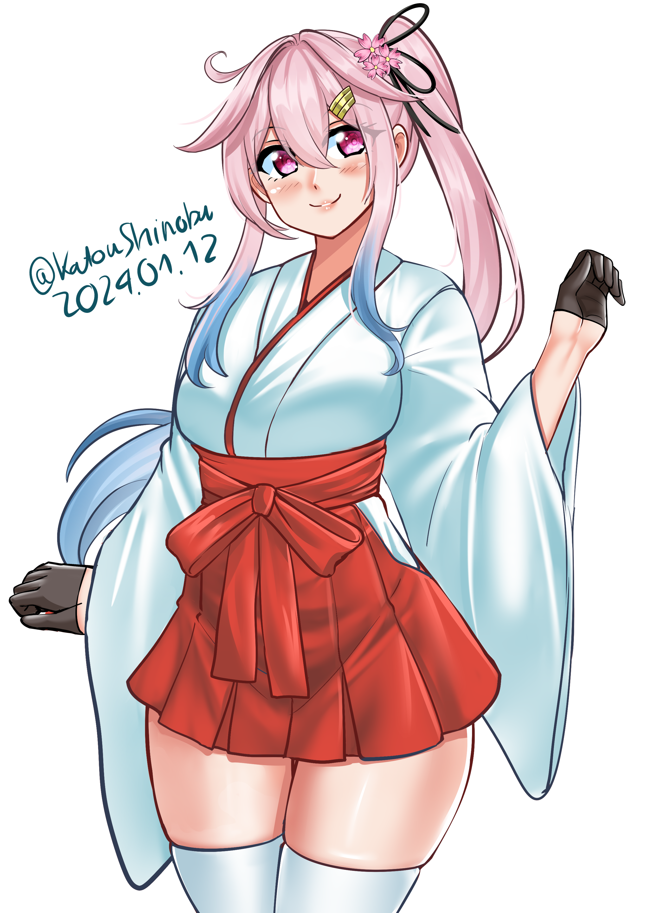 1girl absurdres alternate_costume black_gloves blue_hair dated gloves gradient_hair hair_flaps hakama hakama_short_skirt hakama_skirt half_gloves harusame_(kancolle) highres japanese_clothes kantai_collection katou_shinobu kimono kosode long_hair looking_at_viewer miko multicolored_hair one-hour_drawing_challenge pink_hair red_eyes red_hakama side_ponytail simple_background skirt solo thighhighs twitter_username white_background white_kimono white_thighhighs wide_sleeves