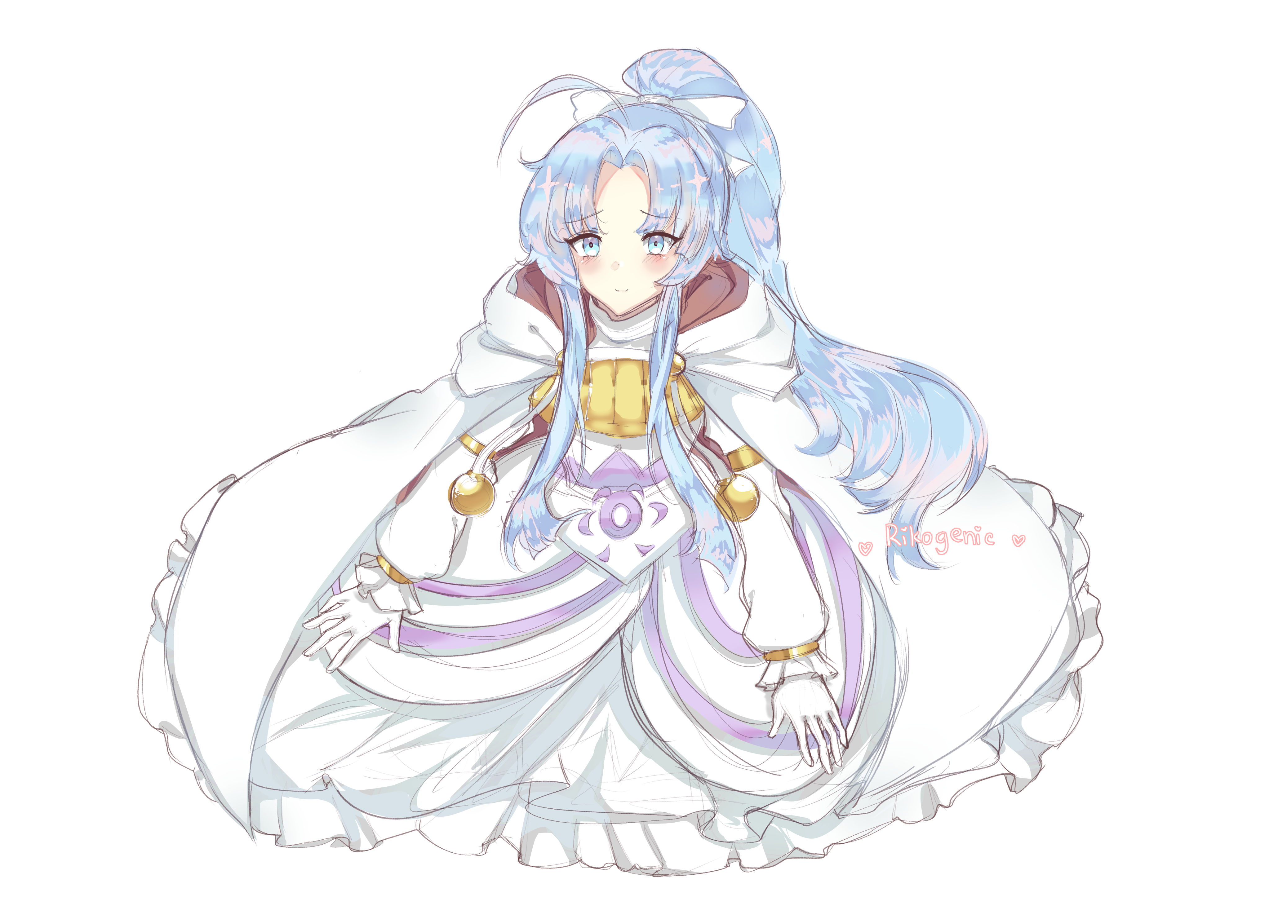 1girl absurdres aqua_eyes aqua_hair blush frills gloves golden_sun highres hime_cut mia_(golden_sun) ponytail rikogenic robe solo white_gloves white_robe white_theme