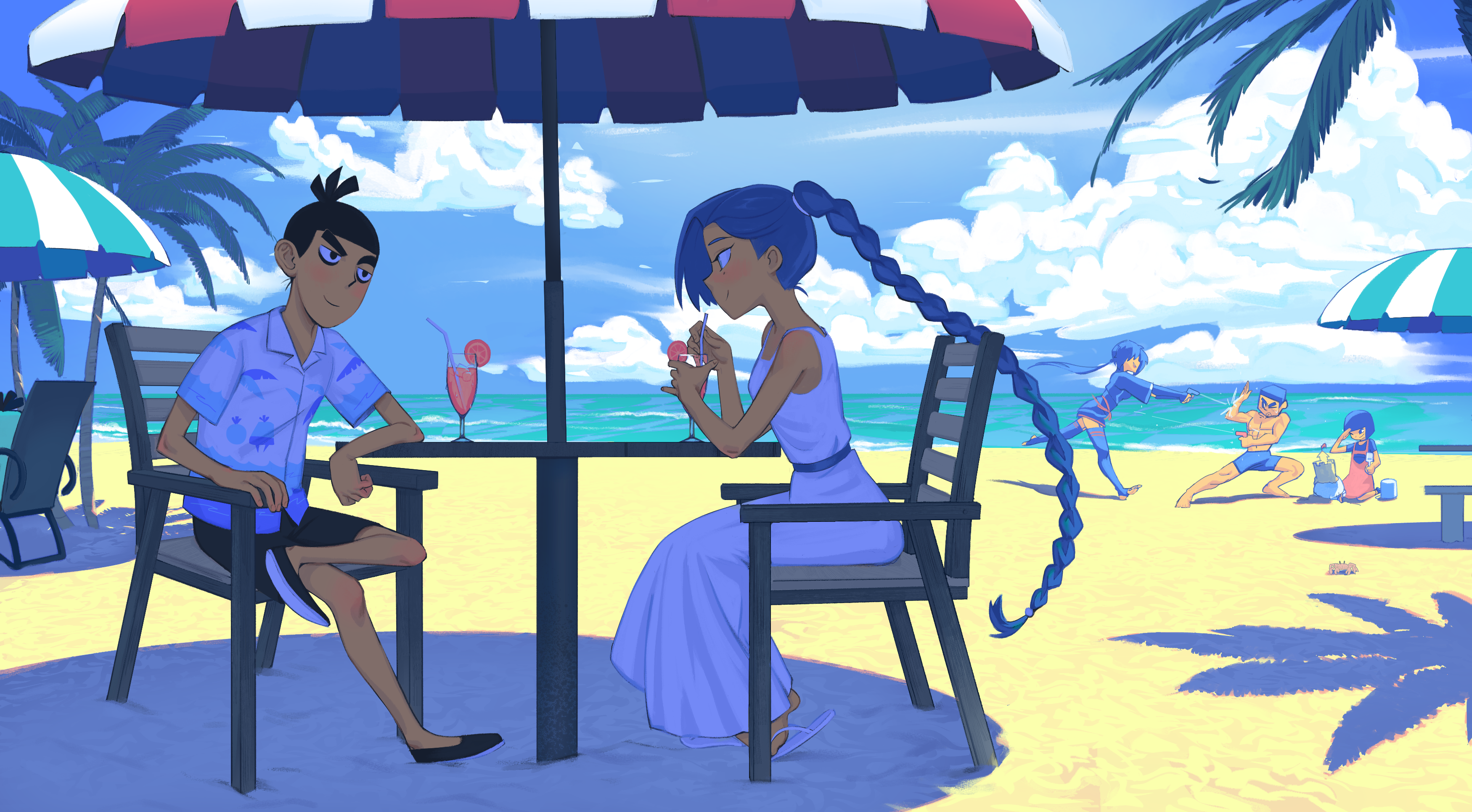 1boy 1girl absurdres beach blush cloud dress highres kansokusha outdoors scissor_seven seven_(scissor_seven) shirt smile smiley_face sundress sunlight thirteen_(scissor_seven) tropical white_dress