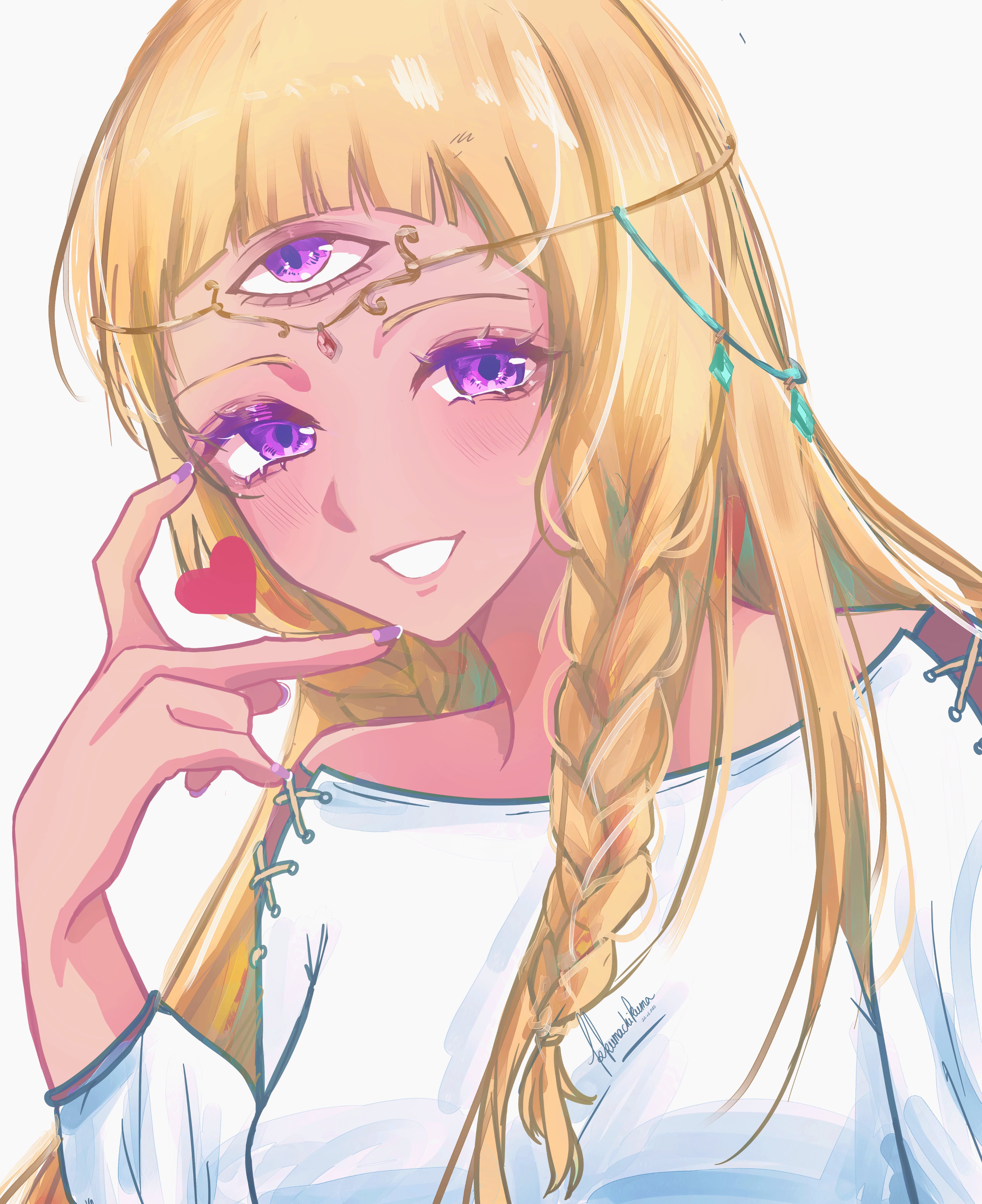 1girl absurdres blonde_hair commentary dark-skinned_female dark_skin dress eupha_(metaphor:_refantazio) fingernails heart highres jewelry kkumachi long_hair looking_at_viewer metaphor:_refantazio open_mouth purple_eyes purple_nails signature simple_background smile solo third_eye white_background white_dress