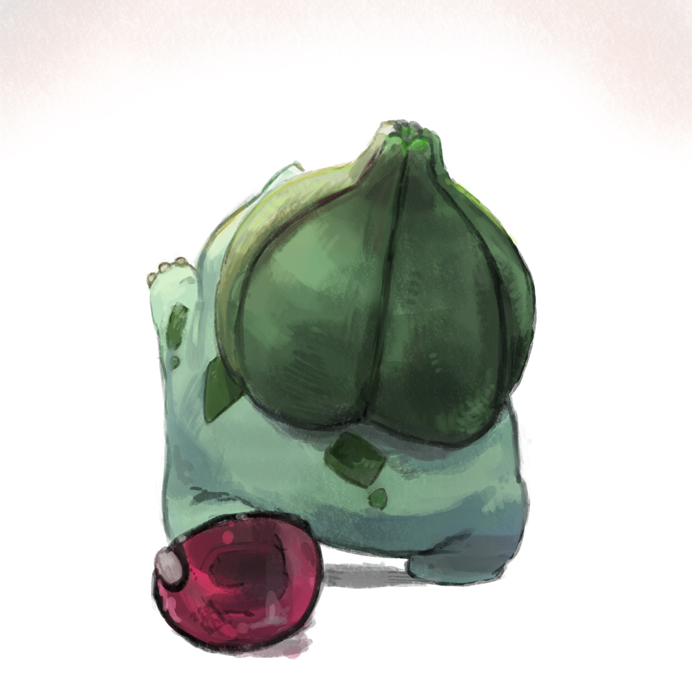 bulbasaur commentary_request creature creature_focus from_behind fumuna gen_1_pokemon nintendo no_humans poke_ball pokemon pokemon_(creature) simple_background solo white_background