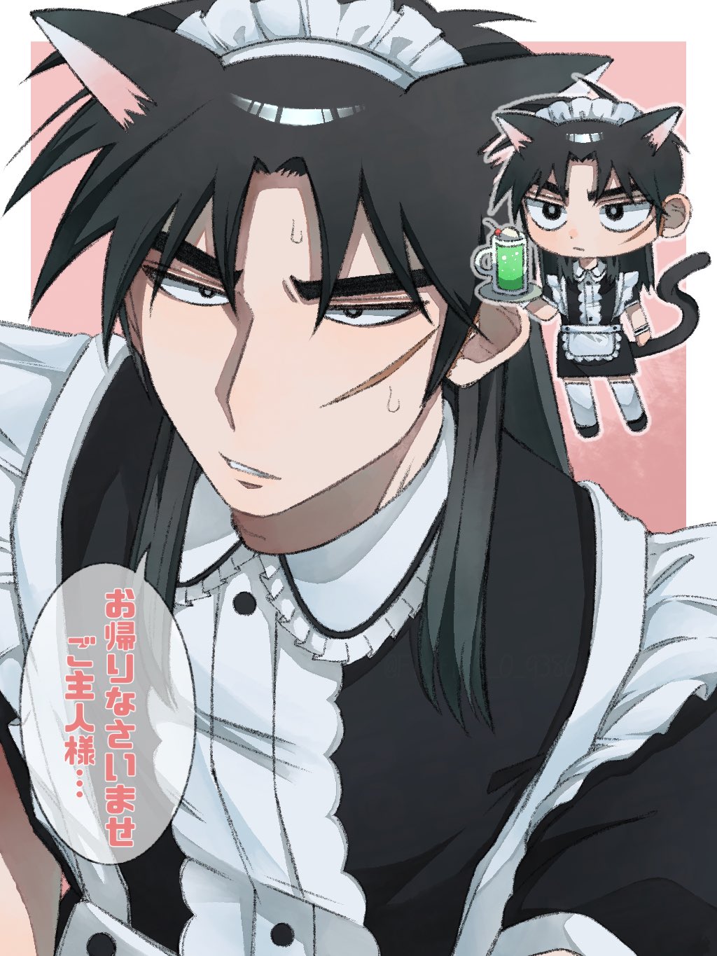 1boy animal_ears black_hair cat_ears cat_tail collared_dress crossdressing crossdressing_(mtf) dress food frills highres ice_cream ice_cream_float itou_kaiji tobaku_mokushiroku_kaiji long_hair maid maid_headdress male_maid pink_background scar scar_on_face tail thighhighs translation_request white_thighhighs