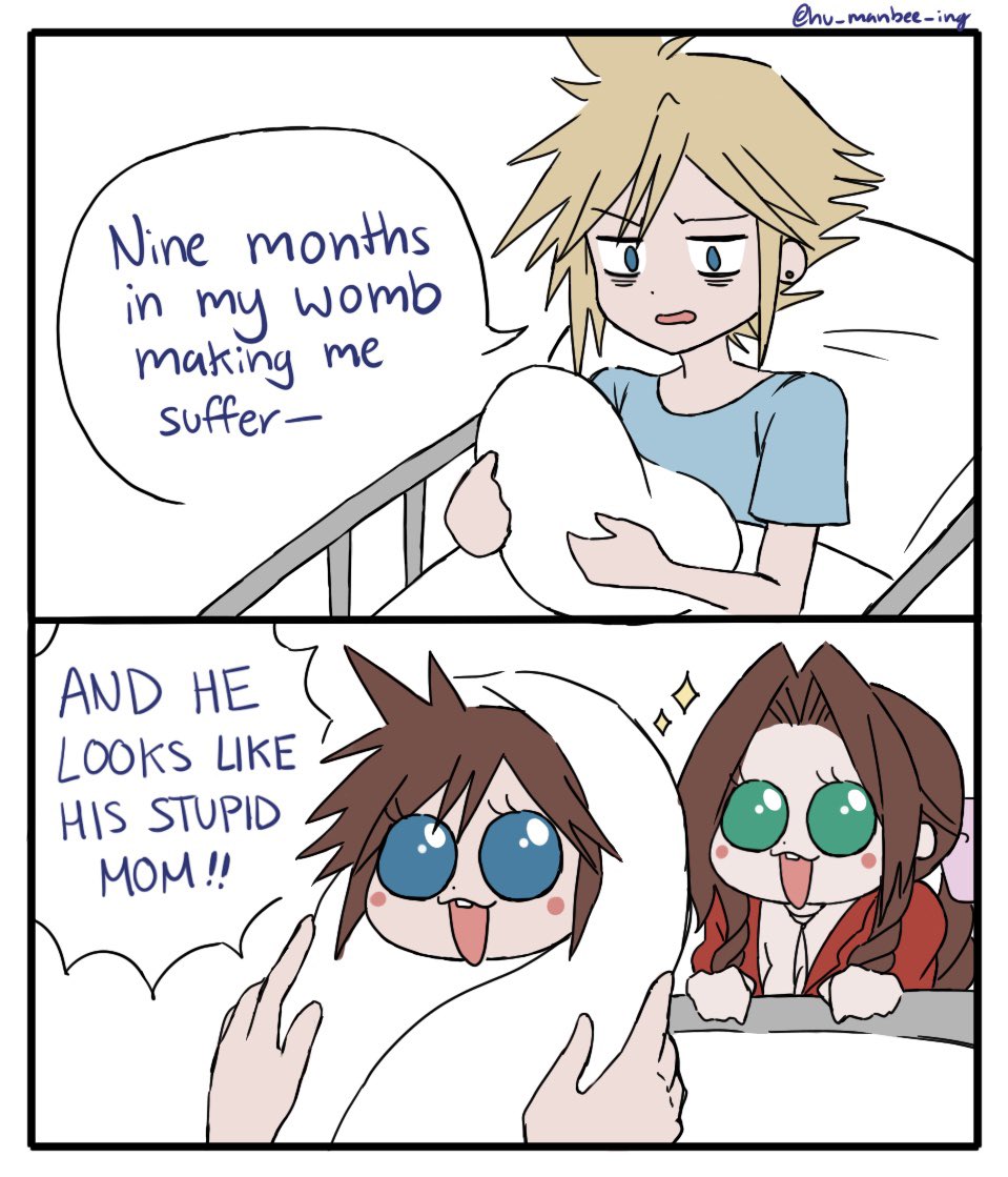 aerith_gainsborough and_he_looks_like_his_stupid_dad_(meme) baby bags_under_eyes blonde_hair blue_eyes blue_shirt border braid braided_ponytail breasts brown_hair buck_teeth carrying carrying_baby carrying_person cleavage cloud_strife couple earrings english_text family father_and_child father_and_son final_fantasy final_fantasy_vii final_fantasy_vii_rebirth final_fantasy_vii_remake furrowed_brow green_eyes hair_ribbon hetero hu_manbee_ing if_they_mated jacket jewelry kingdom_hearts looking_at_another male_pregnancy medium_breasts meme mother_and_child mother_and_son open_mouth parent_and_child parted_bangs pink_ribbon red_jacket ribbon shirt short_hair sidelocks single_earring smile sora_(kingdom_hearts) sparkle spiked_hair teeth twitter_username wavy_mouth white_background white_border
