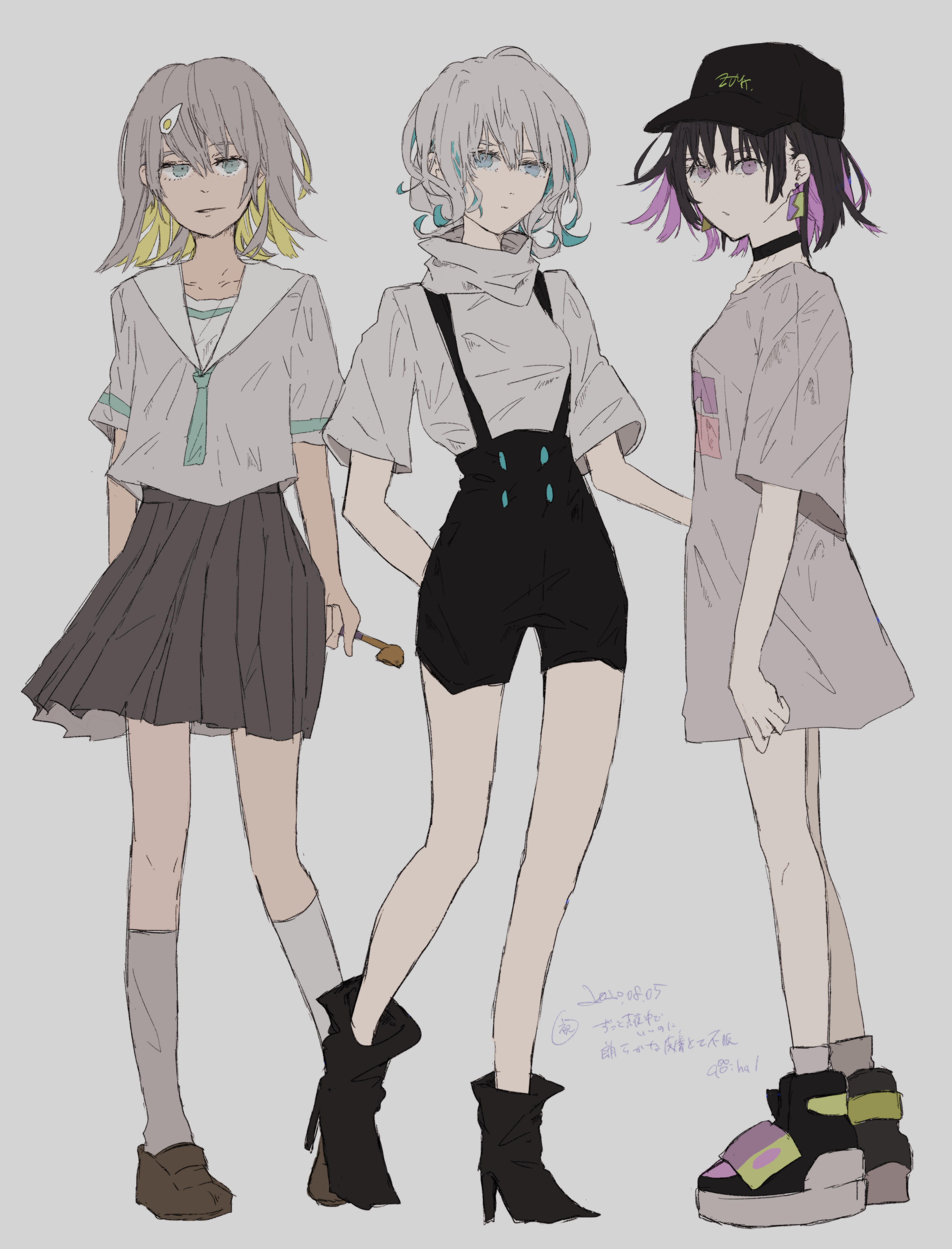 1other 2girls absurdres ankle_boots anulioa aqua_eyes aqua_necktie aqua_trim baseball_cap black_choker black_footwear black_hair black_hat black_overalls black_skirt blonde_hair blue_hair boots brown_footwear choker colored_inner_hair earrings fastening_(zutomayo) grey_hair grey_shirt grey_socks hat highres holding jewelry kneehighs milabo_(zutomayo) multicolored_hair multiple_girls necktie nira-chan nira-chan_(milabo)_(zutomayo) nira-chan_(obenkyou_shitoiteyo)_(zutomayo) obenkyou_shitoiteyo overalls pleated_skirt purple_hair sailor_collar shirt shoes skirt socks teiketsu_(fastening)_(zutomayo) teiketsu_(zutomayo) turtleneck turtleneck_shirt white_sailor_collar white_shirt wide_sleeves zutto_mayonaka_de_ii_no_ni