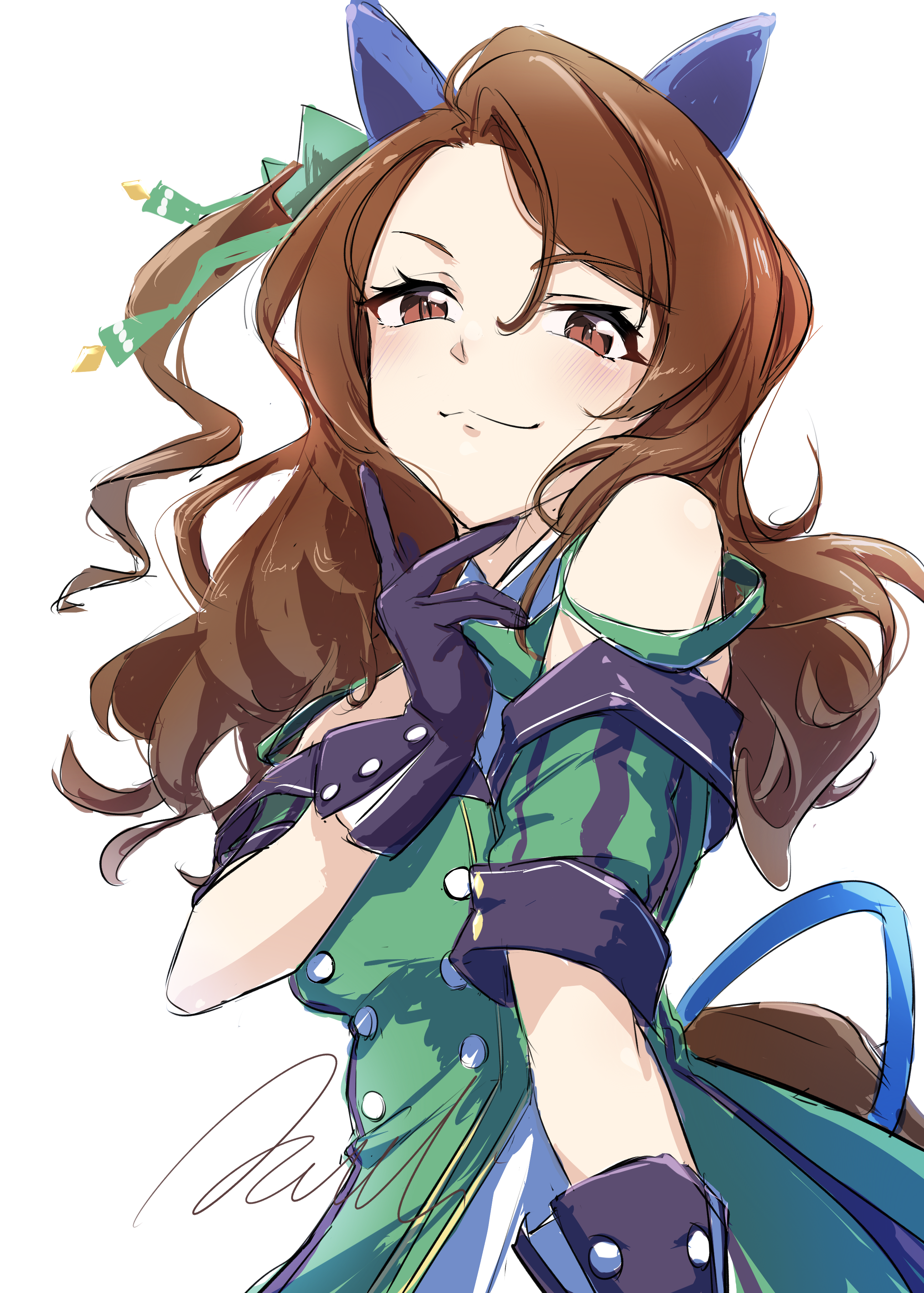 1girl absurdres animal_ears azuki1matcha black_gloves brown_eyes brown_hair dress gloves green_dress highres horse_ears horse_girl king_halo_(umamusume) looking_at_viewer simple_background smile solo umamusume white_background