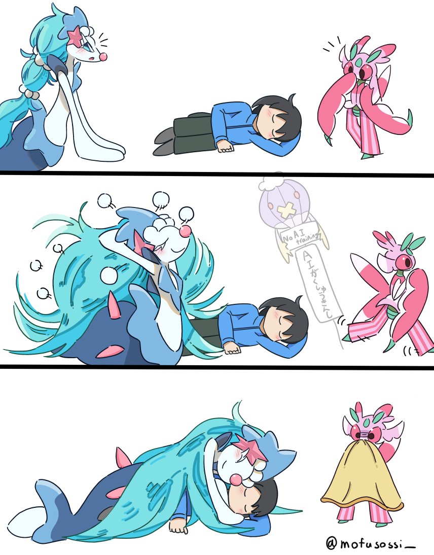 1boy 2girls alternate_color antennae arms_up arthropod_girl arthropod_limbs artist_name black_hair black_pants blanket blue_eyes blue_hair blue_jacket blush closed_eyes colored_eyelashes colored_sclera colored_skin comic commentary drifblim fang full_body furry furry_female gen_4_pokemon gen_7_pokemon hair_down hair_ornament hug jacket japanese_text looking_at_viewer lurantis lying lying_on_person mantis_girl mermaid monster_girl mosseso_sefu multiple_girls nintendo no_mouth notice_lines on_side open_mouth pants pink_eyes pink_skin plant_girl pokemon pokemon_(creature) praying_mantis primarina sea_lion shiny_pokemon short_hair simple_background sleeping smile snout standing starfish_hair_ornament white_fur white_skin