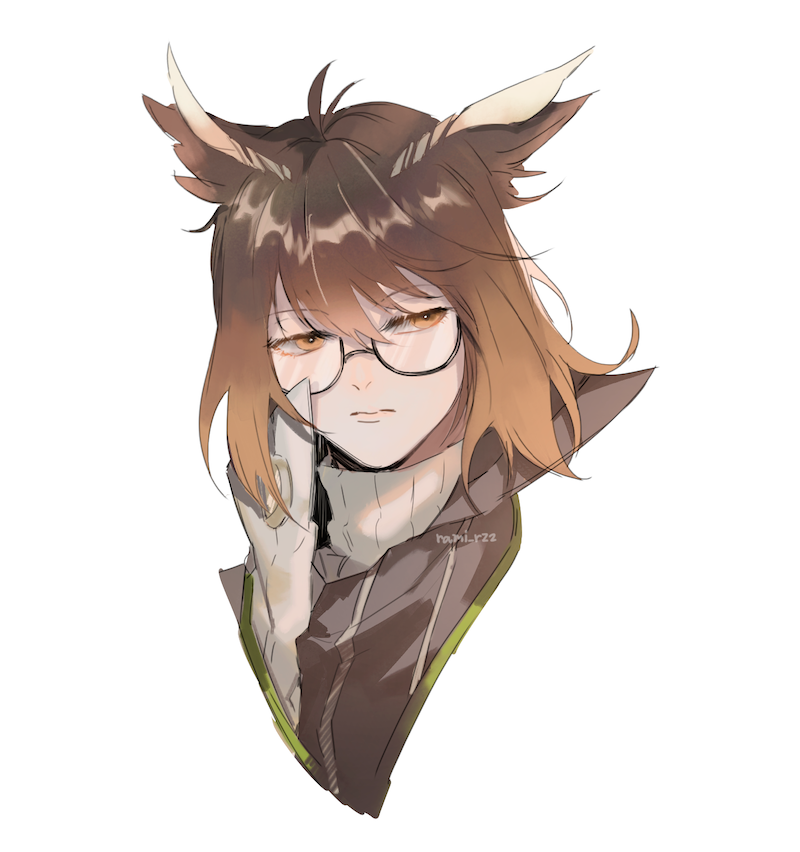 1girl antenna_hair arknights brown_eyes brown_hair closed_mouth cropped_torso eyelashes glasses hair_between_eyes long_hair rami_rz ribbed_sweater short_hair signature silence_(arknights) simple_background solo sweater white_background white_sweater