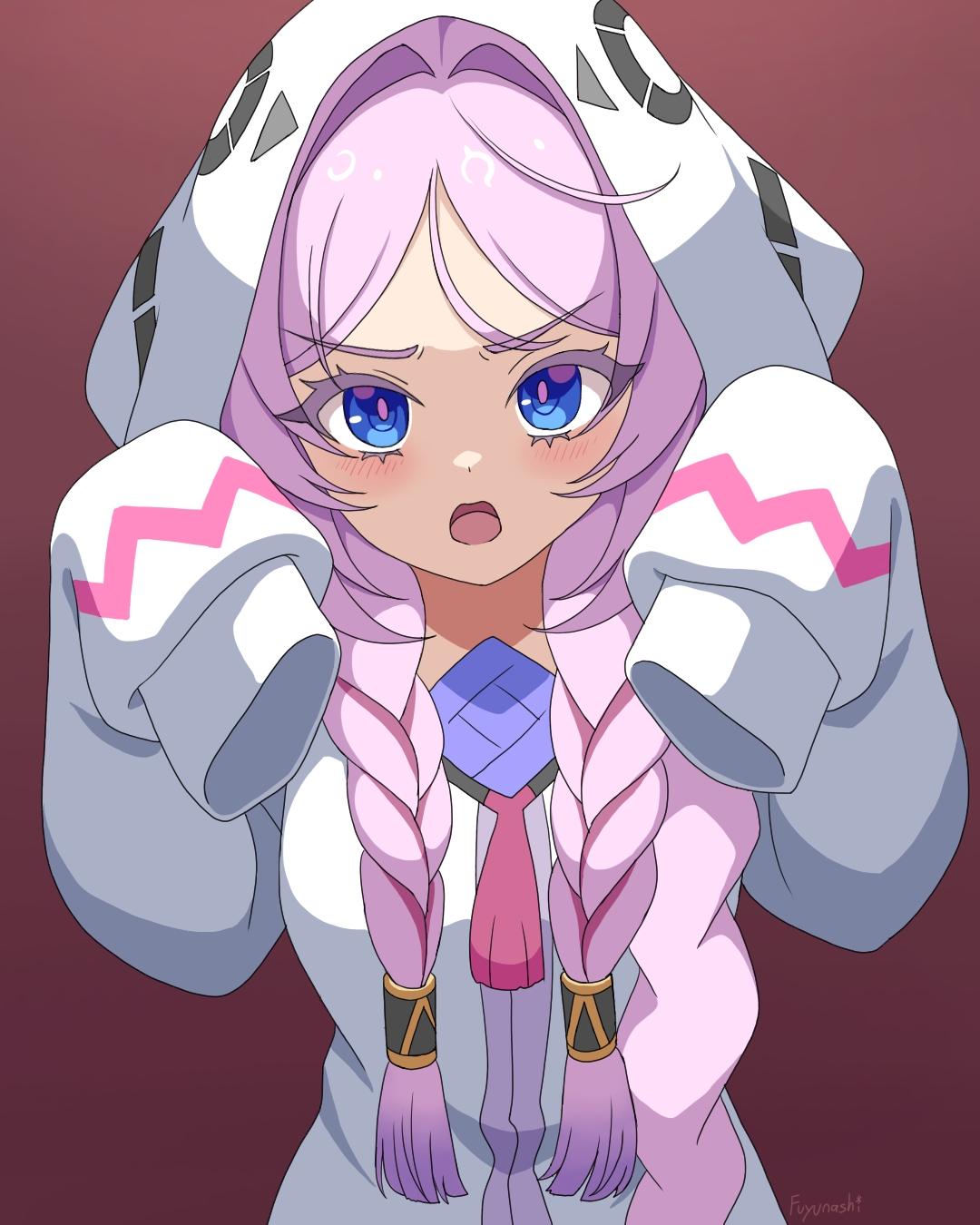 1girl blue_eyes blush braid citlali_(genshin_impact) commentary english_commentary fuyunash1 genshin_impact highres long_hair looking_at_viewer multicolored_hair onesie open_mouth pink_hair pink_pupils purple_hair red_background signature sleeves_past_wrists solo twin_braids very_long_hair