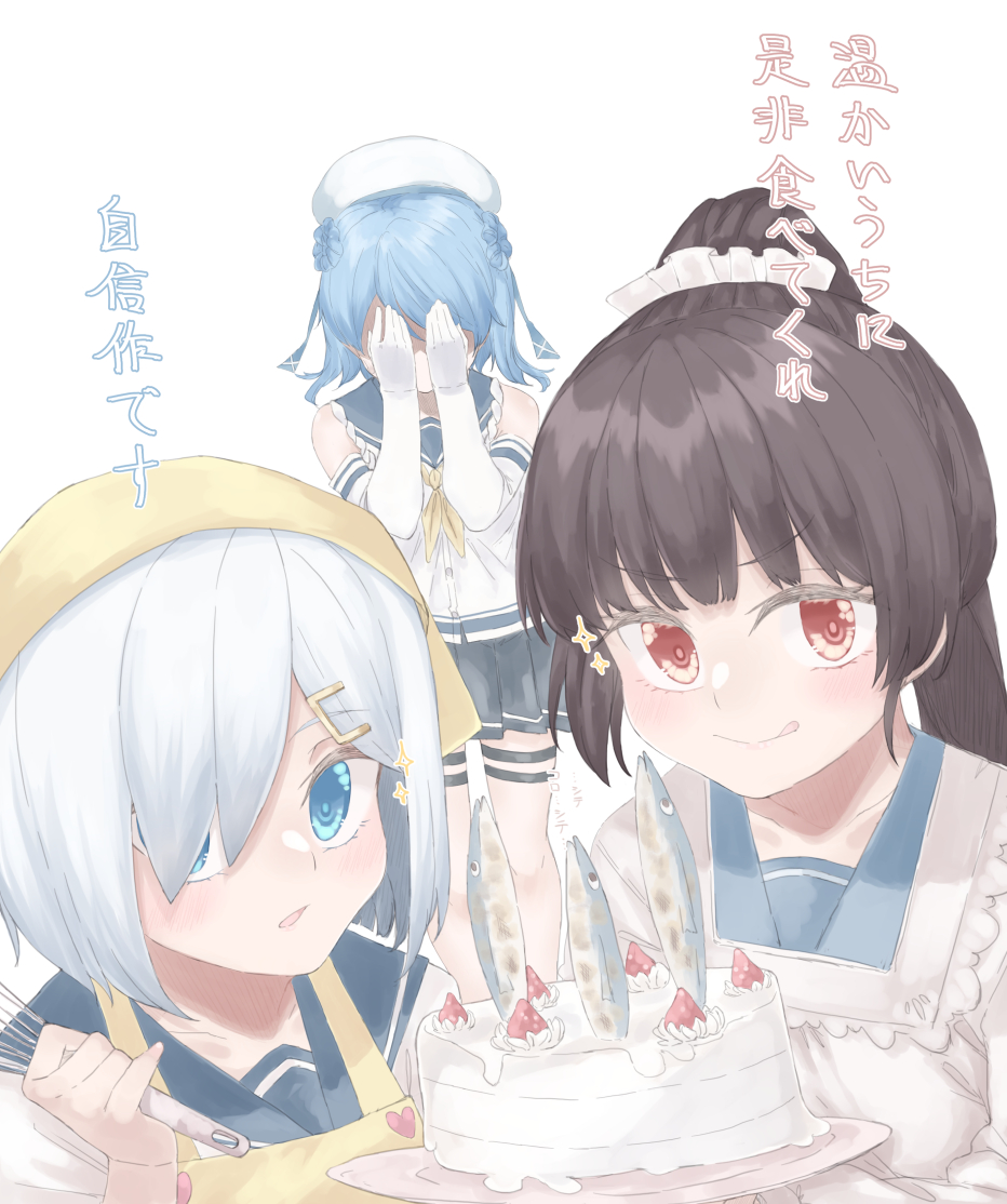 3girls apron azumaya_toride bandana black_hair blue_eyes blue_hair blue_sailor_collar cake commentary_request covering_face double_bun elbow_gloves fish food gloves grey_hair grey_skirt hair_bun hair_ornament hair_over_one_eye hairclip hamakaze_(kancolle) hamakaze_(valentine)_(kancolle) hat isokaze_(kancolle) isokaze_(saury_festival)_(kancolle) kantai_collection kappougi long_hair looking_at_viewer multiple_girls neckerchief pleated_skirt ponytail red_eyes sailor_collar sailor_hat school_uniform serafuku short_hair skirt sleeves_rolled_up translation_request upper_body urakaze_(kancolle) white_gloves white_hat yellow_apron yellow_bandana yellow_neckerchief