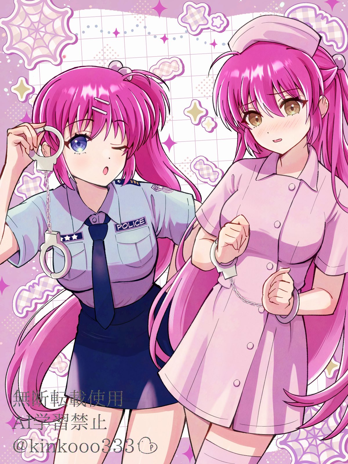 2girls ;o parallel_hairclips ahoge alternate_costume blue_eyes blue_necktie blue_shirt blue_skirt blush bound bound_wrists collared_dress collared_shirt commentary cowboy_shot cuffs dress embarrassed eyelashes eyes_visible_through_hair futaki_kanata hair_between_eyes hair_bobbles hair_ornament hairclip half_updo halloween_costume hand_up handcuffs hat highres holding holding_handcuffs leaning_forward little_busters! long_hair looking_at_viewer multiple_girls necktie nose_blush nurse nurse_cap one_eye_closed pencil_skirt pink_dress pink_hair pink_hat pink_thighhighs piyo_(kinkooo333) purple_background saigusa_haruka shirt short_sleeves siblings side_ponytail sidelocks silk simple_background sisters skirt sparkle spider_web star_(symbol) straight_hair thighhighs twins two-tone_background very_long_hair white_background yellow_eyes zettai_ryouiki