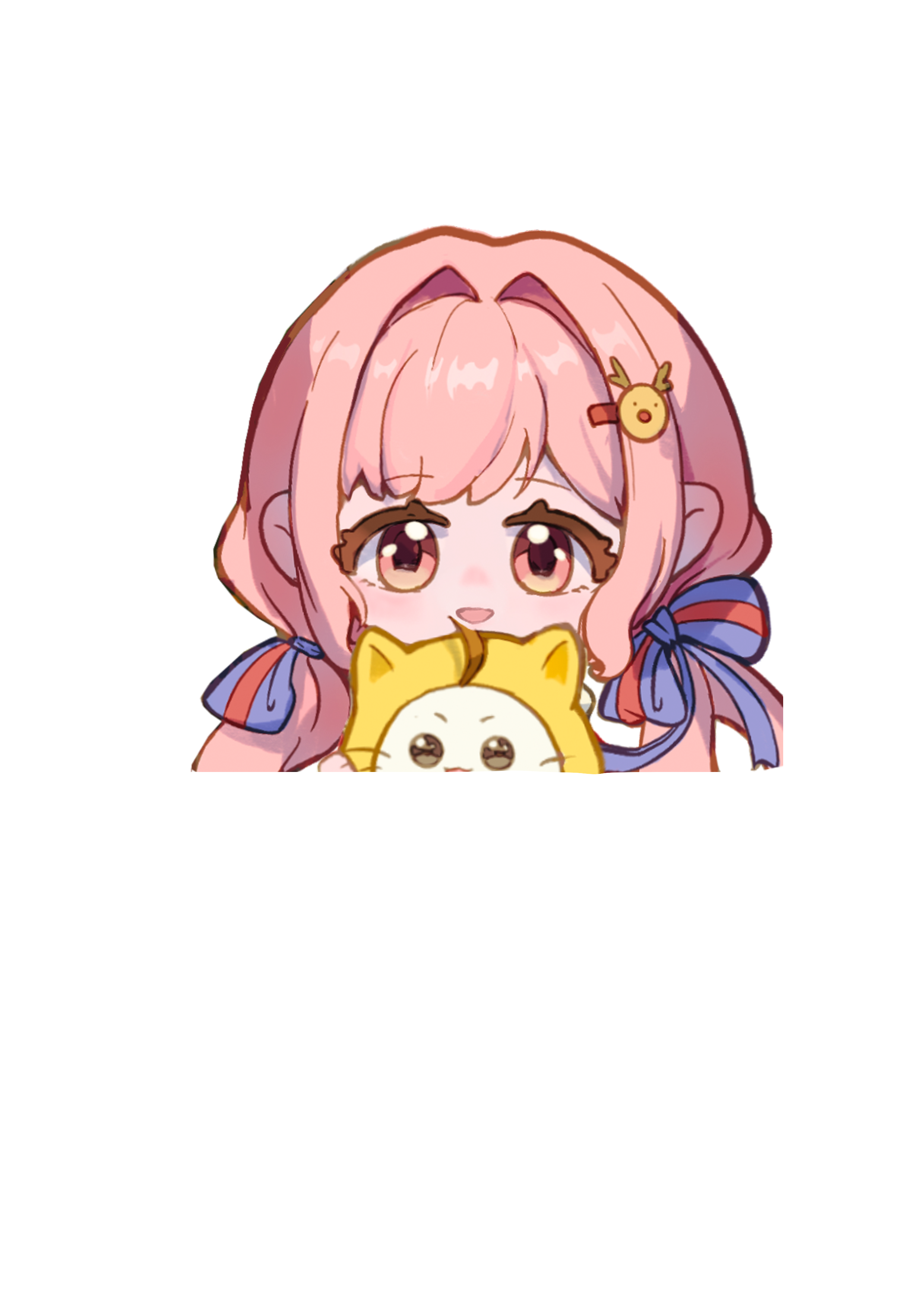 1girl absurdres animal animal_on_lap blue_bow bow brown_eyes cat cat_on_lap chibi clothed_animal ear_covers eyelashes hair_bow hair_intakes hair_ornament hairclip highres hood hood_up long_hair low_twintails meiyou_mingzi momo_(nikki) nikki_(nikki) nikki_(series) on_lap open_mouth outline pink_hair reindeer_hair_ornament single_stripe smile striped_bow tareme transparent_background twintails upper_body very_long_hair whiskers white_cat white_outline yellow_hood