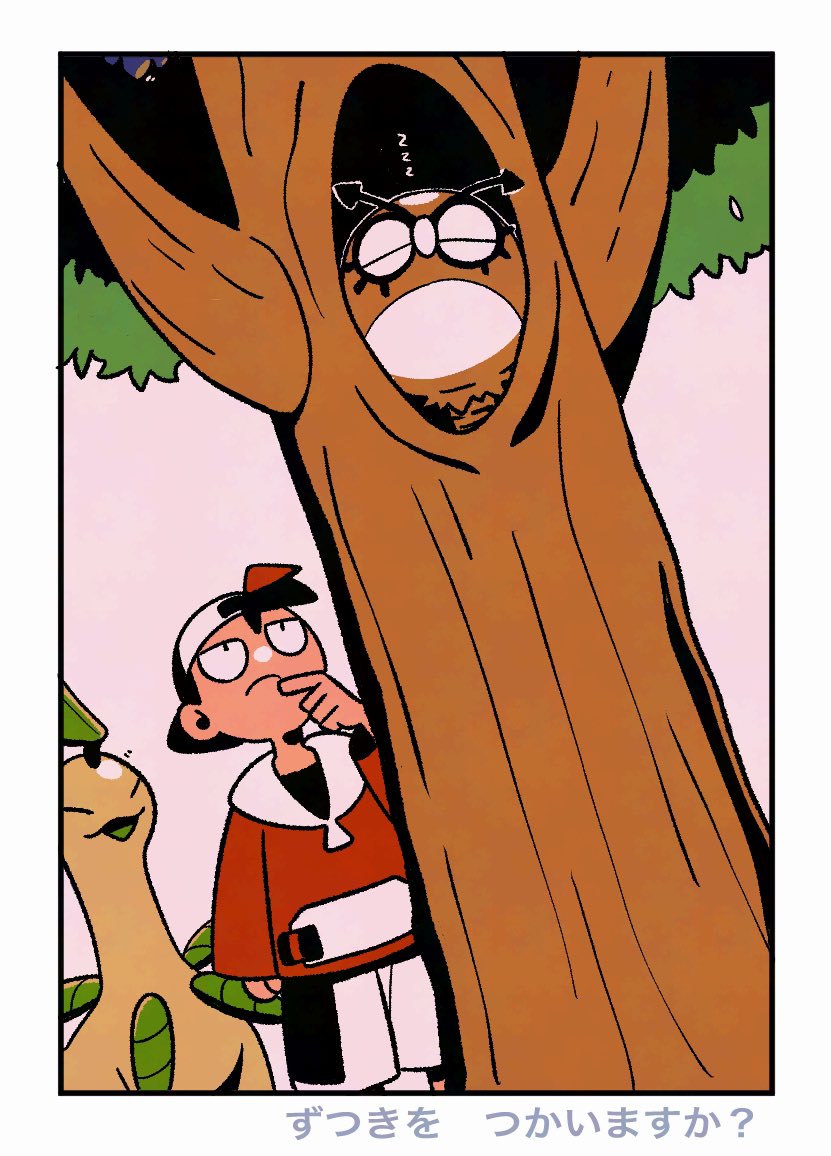 1boy backwards_hat bayleef black_eyes border closed_mouth commentary ethan_(pokemon) frown gen_2_pokemon hand_up hat hoothoot in_tree jacket long_sleeves male_focus nintendo pokemon pokemon_(creature) pokemon_gold/silver/crystal red_jacket shorts sleeping untranslatable_commentary tree tyako_089 white_border white_shorts zzz