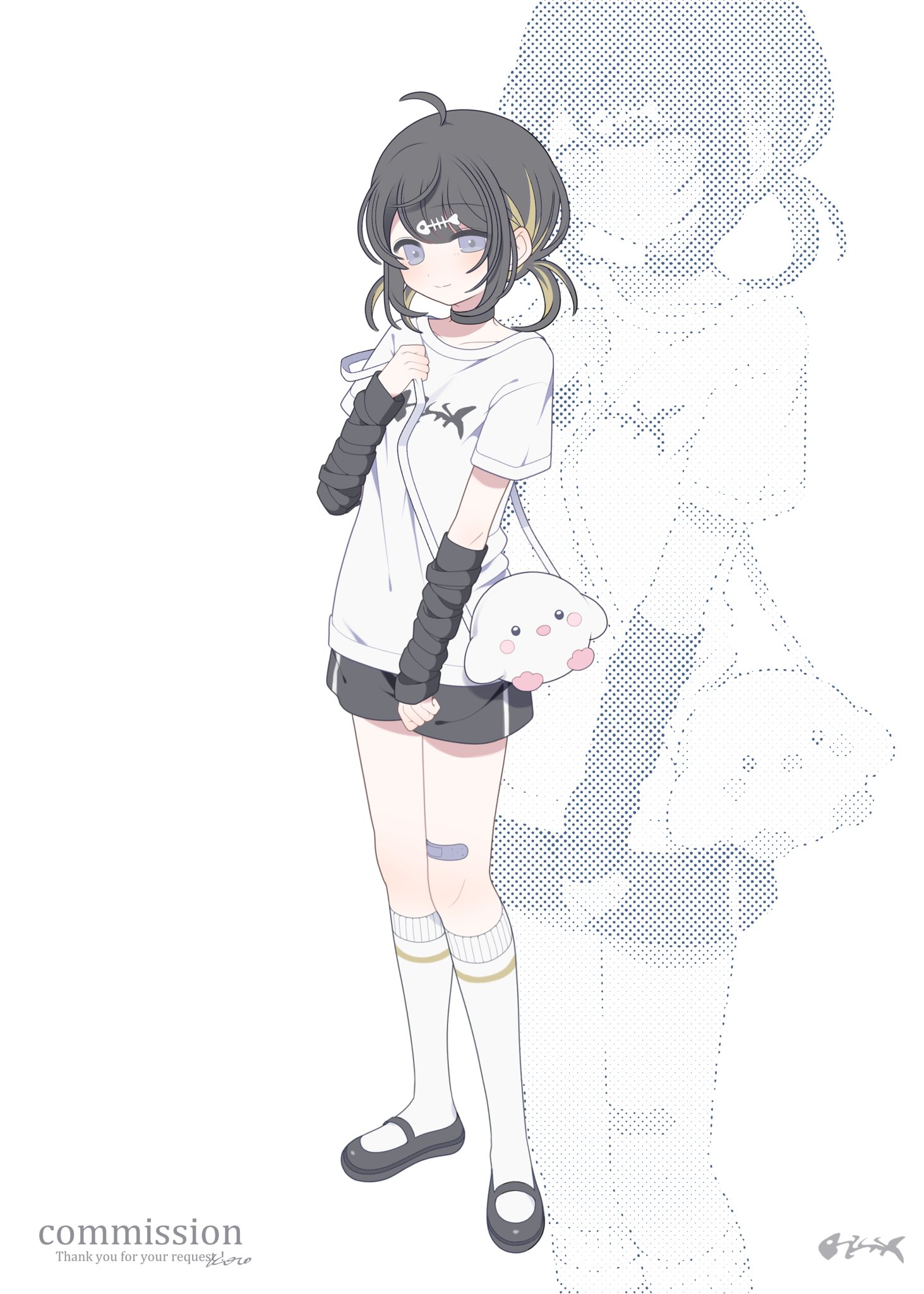 1girl ahoge arm_warmers bag bandaid_on_thigh black_arm_warmers black_choker black_hair black_shoes black_shorts blonde_hair breasts choker closed_mouth commentary commission fish_skeleton_hair_ornament full_body grey_eyes hand_up highres kneehighs kotoruri low_twintails mary_janes multicolored_hair original shirt shoes short_hair short_shorts short_sleeves short_twintails shorts shoulder_bag simple_background single_horizontal_stripe single_vertical_stripe skeb_commission small_breasts smile socks solo standing streaked_hair twintails two-tone_hair white_background white_bag white_shirt white_socks zoom_layer