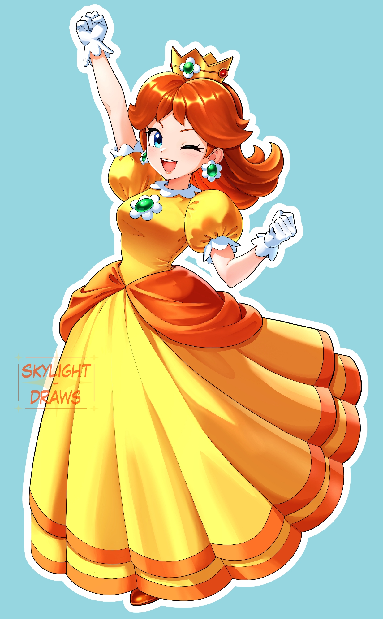 1girl arm_up artist_name blue_background blue_eyes brooch brown_hair crown dress earrings flower_brooch flower_earrings gloves highres jewelry long_hair looking_at_viewer mario_(series) nintendo one_eye_closed open_mouth orange_dress princess_daisy puffy_short_sleeves puffy_sleeves short_sleeves simple_background skylight_draws smile white_gloves