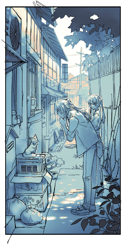 2boys air_conditioner alley archer_(fate/samurai_remnant) bent_over border box building cat door fate/samurai_remnant fate_(series) fence full_body hand_on_own_chin high_ponytail keclpshvli limited_palette long_hair looking_at_another male_focus multiple_boys outdoors pants plant ponytail shirt shoes sign standing trash_bag trash_can tree utility_pole white_border window zheng_chenggong_(fate)