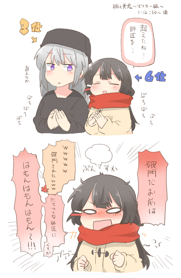 2girls arrow_(symbol) black_hair black_hat black_shirt blush brown_jacket chibi closed_eyes cropped_torso emphasis_lines grey_hair hair_ornament hairclip hat higuchi_kaede higuchi_kaede_(winter_casual) jacket long_hair multiple_girls nijisanji nose_blush open_mouth own_hands_together parted_lips rebecca_(keinelove) red_scarf scarf shirt simple_background translation_request tsukino_mito tsukino_mito_(winter_casual) upper_body v-shaped_eyebrows virtual_youtuber white_background wide_oval_eyes