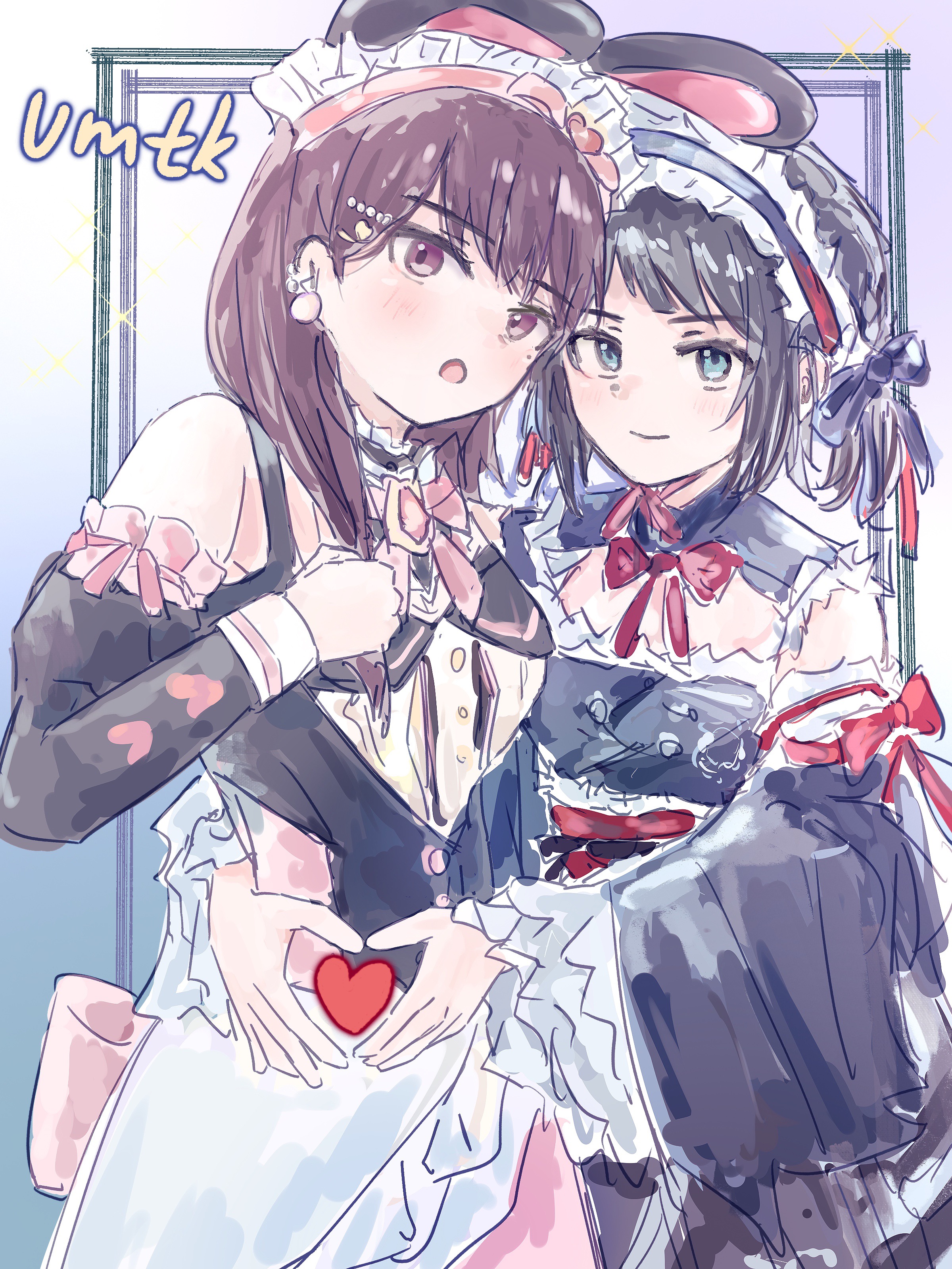 2girls absurdres animal_ears bang_dream! bang_dream!_it's_mygo!!!!! black_dress black_hair blush bow bowtie brown_hair closed_mouth commentary_request detached_sleeves dress ear_piercing earrings fake_animal_ears heart heart_hands heart_in_heart_hands highres jewelry keyun long_hair long_sleeves looking_at_viewer maid_headdress multiple_girls official_alternate_costume open_mouth piercing purple_eyes rabbit_ears red_bow red_bowtie shiina_taki pairing_name timoris_(bang_dream!) yahata_umiri