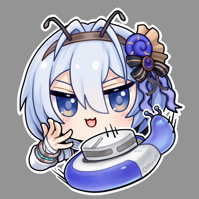 1girl animal antennae artist_name blue_eyes blue_hair blush brown_hairband chibi chibi_only commentary english_commentary fake_antennae grey_background hair_between_eyes hairband looking_at_viewer medium_hair open_mouth othreo outline simple_background smile snail snail_hair_ornament solo strinova throwing white_outline yugiri_(strinova)