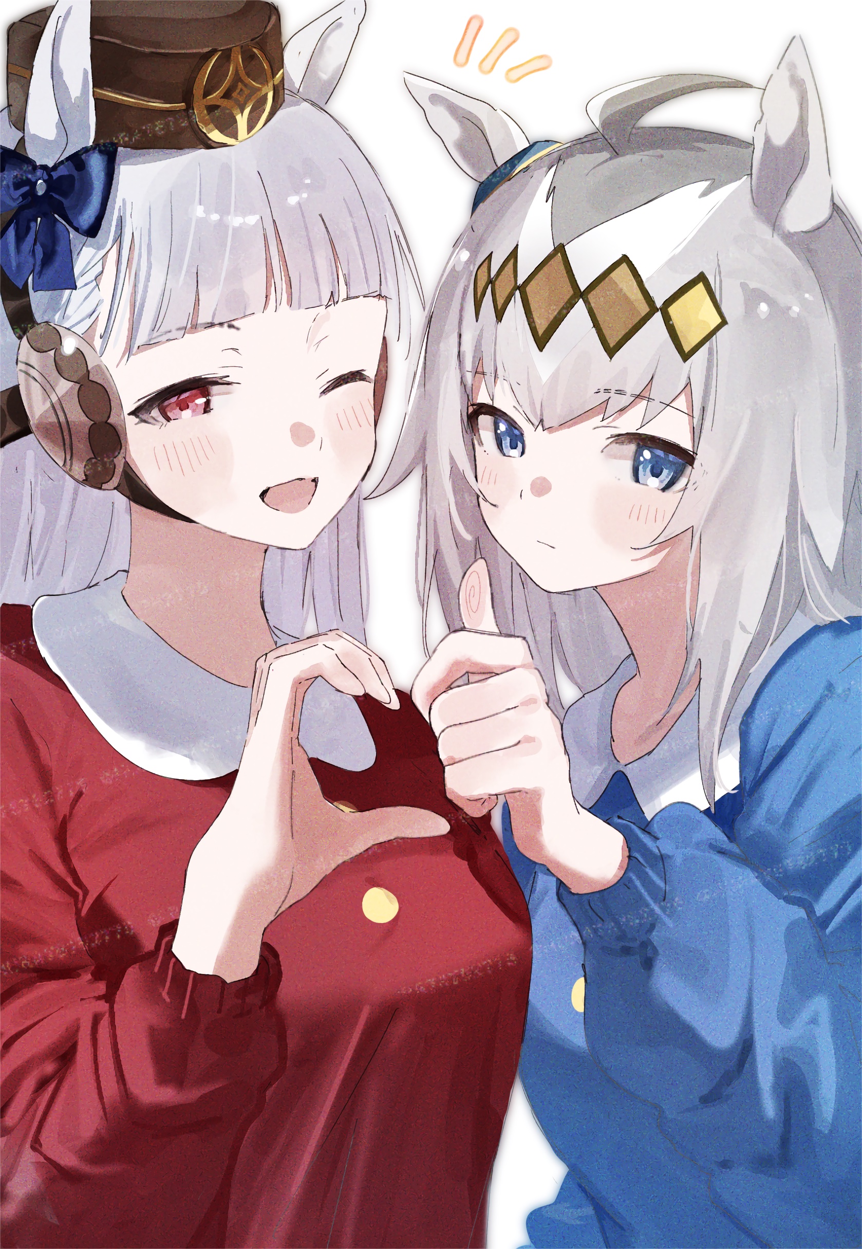 2girls ;d absurdres ahoge animal_ears blue_eyes blue_shirt blunt_bangs blush brown_hat commentary_request earmuffs gold_ship_(umamusume) grey_hair ha_(hura76752775) half-heart_hands hat heart_hands_failure highres horse_ears horse_girl long_sleeves looking_at_viewer mini_hat multiple_girls oguri_cap_(umamusume) one_eye_closed open_mouth red_eyes red_shirt shirt smile smock thumbs_up umamusume upper_body