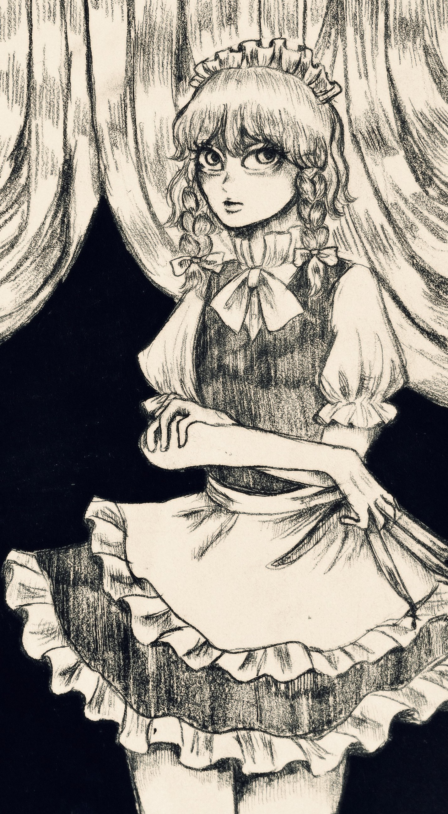 1girl absurdres apron braid cropped_legs crossed_arms greyscale highres izayoi_sakuya looking_at_viewer maid maid_apron maid_headdress monochrome neri_namgal short_sleeves solo touhou twin_braids waist_apron