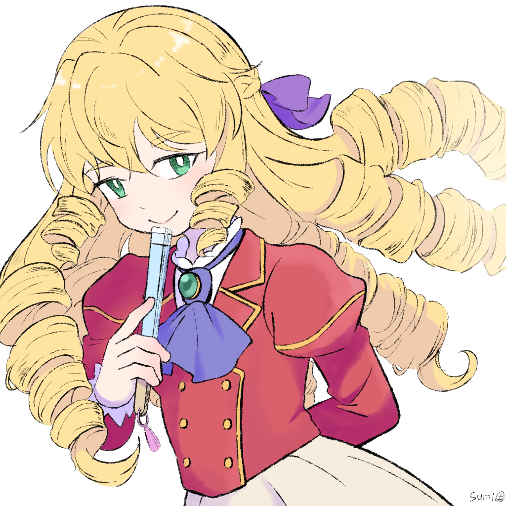 1girl akuyaku_reijou_tensei_ojisan arm_behind_back ascot blonde_hair closed_mouth drill_hair flat_chest folding_fan grace_auvergne green_eyes hair_ribbon hand_fan holding holding_fan jacket juliet_sleeves lips long_hair long_sleeves looking_at_viewer puffy_sleeves purple_ascot purple_ribbon red_jacket ribbon school_uniform shirt signature simple_background skirt smile solo sumi_(user_evka8372) very_long_hair white_background white_shirt white_skirt