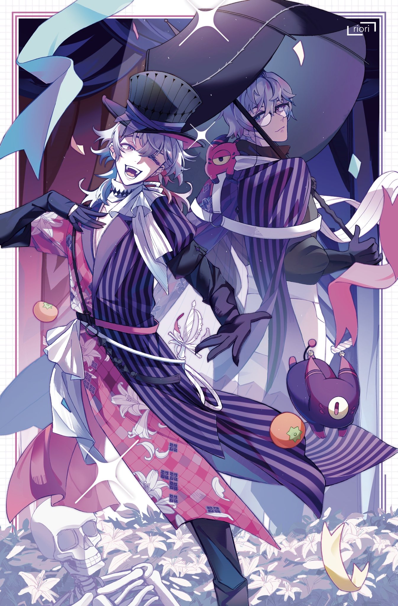 2boys bettel_2_(gavis_bettel) bishounen black_gloves blue_eyes blue_hair blue_ribbon blush coat commentary creature creature_on_shoulder diamond_choker english_commentary eyelashes floral_print flower gavis_bettel gavis_bettel_(1st_costume) gloves grey_hair hair_between_eyes happy hat heterochromia highres holding holding_umbrella holostars holostars_english jerry_(gavis_bettel) lily_print long_sleeves looking_at_viewer male_focus medium_hair multicolored_coat multicolored_hair multiple_boys on_shoulder one_eye_closed open_mouth phantom_(gavis_bettel) pink_eyes pink_hair ribbon riori scarf skeleton smile sparkle standing striped_coat teeth tomato top_hat umbrella vertical-striped_coat virtual_youtuber white_flower white_scarf