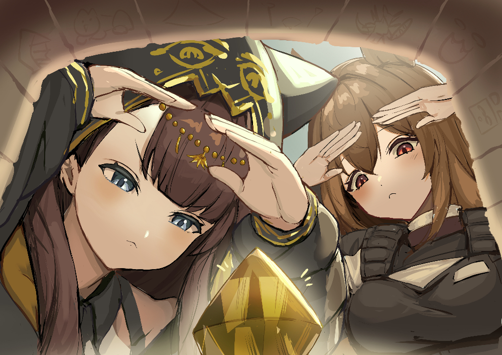 2girls :< animal_ear_hood animal_ears animal_hood arknights arms_up black_jacket blue_eyes breasts brown_eyes brown_hair ceobe_(arknights) chou_oji commentary_request dog_ears dog_girl facing_viewer fake_animal_ears gem hair_between_eyes head_chain hood hood_up hooded_jacket jacket jewelry long_hair long_sleeves looking_at_object multiple_girls pepe_(arknights) yellow_gem
