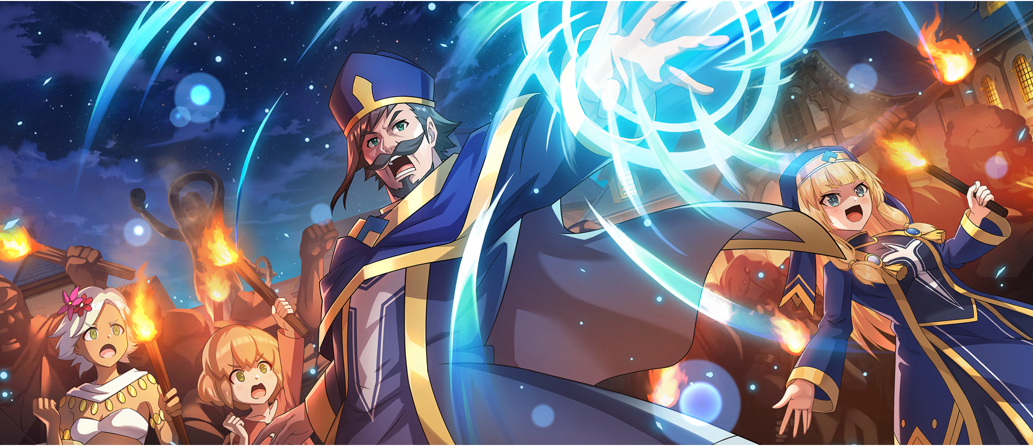 1boy 3girls :d beard black_hair blonde_hair blue_dress blue_eyes blue_hat blue_robe blue_veil blunt_bangs brown_hair building cassock casting_spell cecily_(konosuba) cloud cloudy_sky crowd dress facial_hair flower from_below game_cg gold_trim green_eyes hair_flower hair_ornament hat highres holding holding_torch kono_subarashii_sekai_ni_shukufuku_wo! konosuba!_fantastic_days long_dress long_hair long_sleeves low-tied_sidelocks mitre multiple_girls mustache night official_art open_mouth outstretched_arm pink_flower priest priestess red_flower robe shaded_face short_hair sidelocks sky smile torch v-shaped_eyebrows veil white_hair zesta_(konosuba)