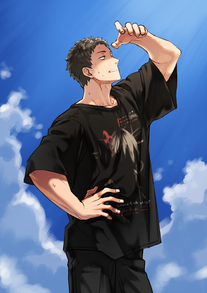 1boy black_eyes black_hair black_pants black_shirt blue_sky cloud collarbone commentary_request cowboy_shot day hand_on_own_hip hand_up looking_up male_focus nijisanji outdoors pants parted_lips print_shirt shirt short_hair short_sleeves sky solo standing succo_gura sunlight sweat t-shirt very_short_hair virtual_youtuber yashiro_kizuku