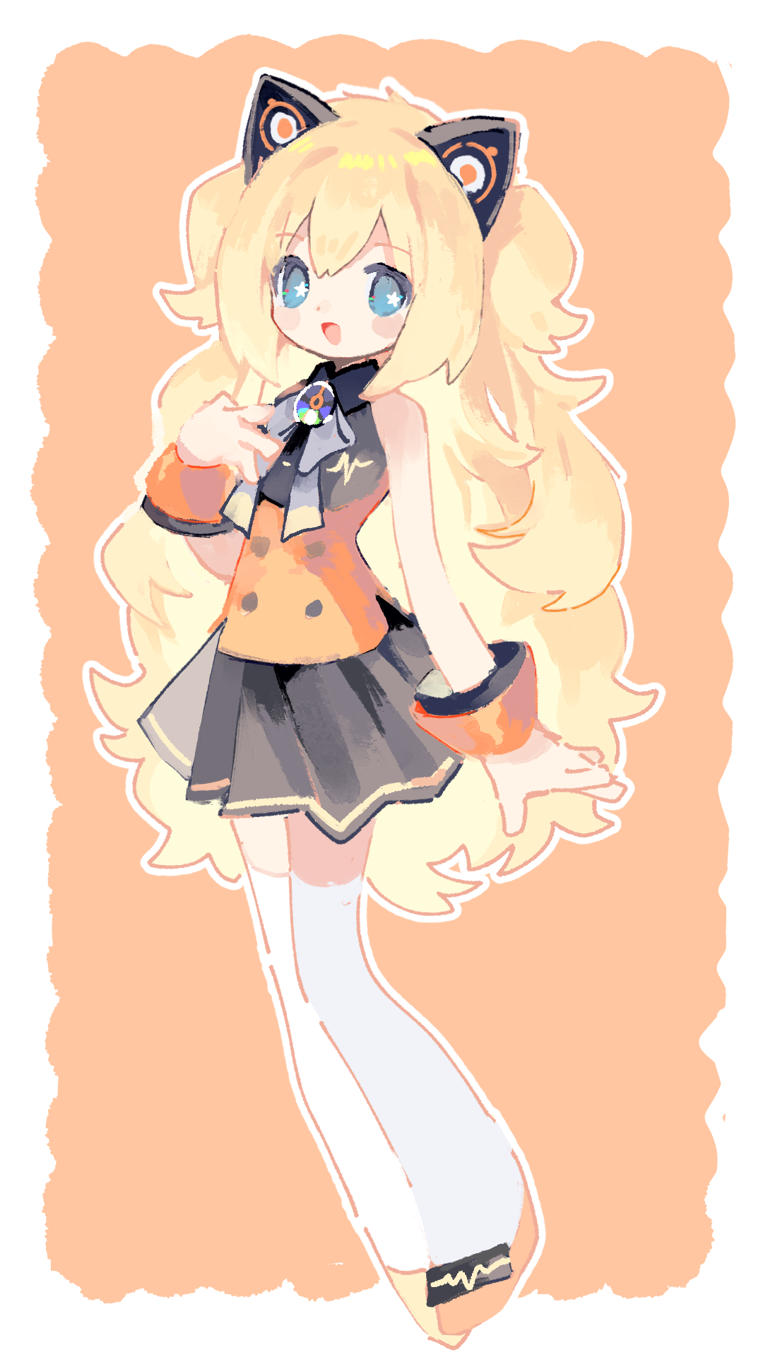 1girl :d black_shirt black_skirt blonde_hair blue_eyes blush_stickers border bow brown_background brown_shoes collared_shirt grey_bow hand_up highres long_hair looking_at_viewer mechuragi open_mouth pleated_skirt seeu shirt shoes skirt sleeveless sleeveless_shirt smile solo star_(symbol) star_in_eye symbol_in_eye thighhighs two_side_up very_long_hair vocaloid white_border white_thighhighs wrist_cuffs