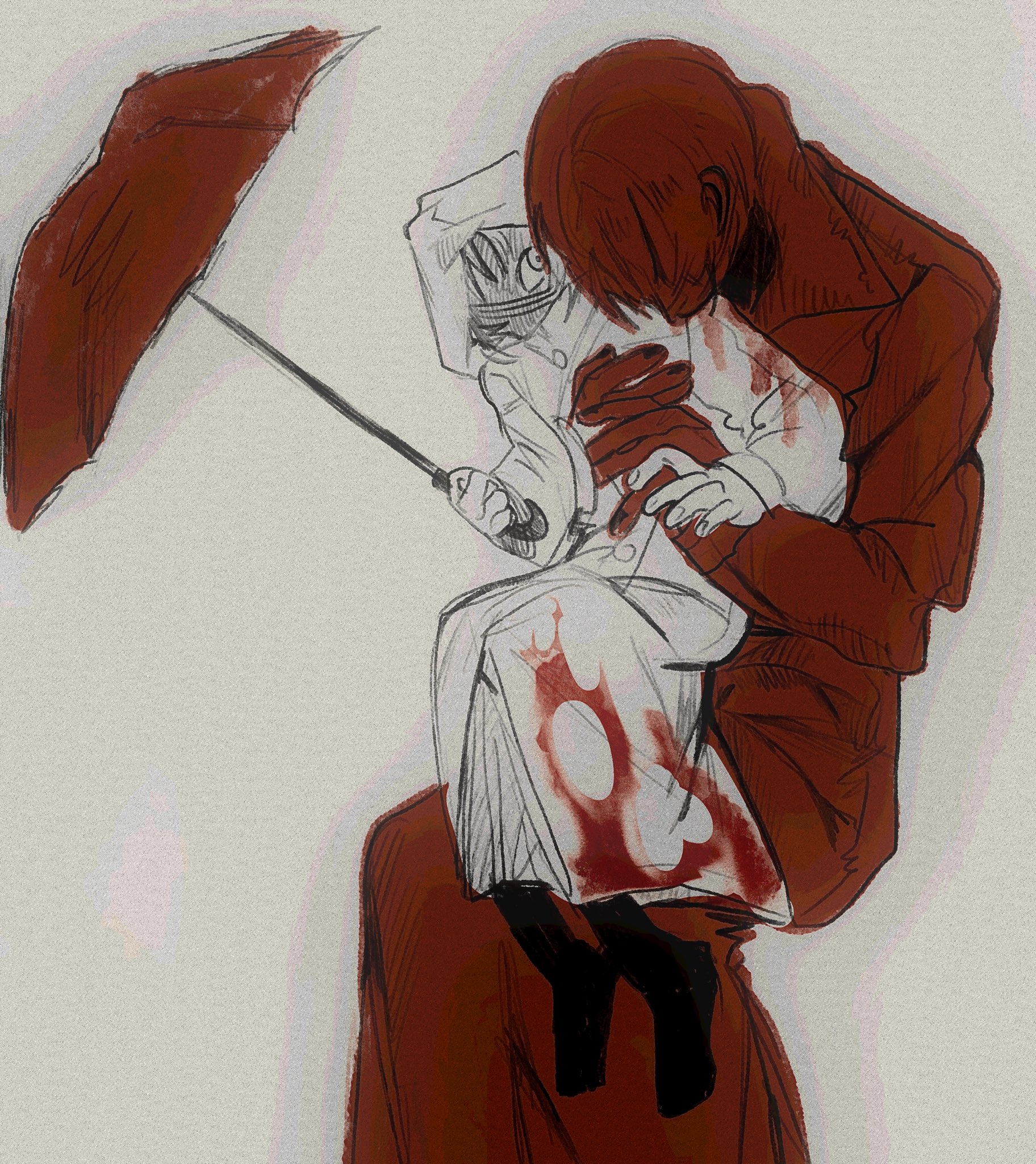 1boy 1girl blood blood_on_clothes coat grey_background adashino_adami highres holding holding_umbrella homicipher looking_at_another mell_yipie mr._scarletella raincoat red_coat red_hair red_umbrella short_hair sitting sitting_on_lap sitting_on_person umbrella