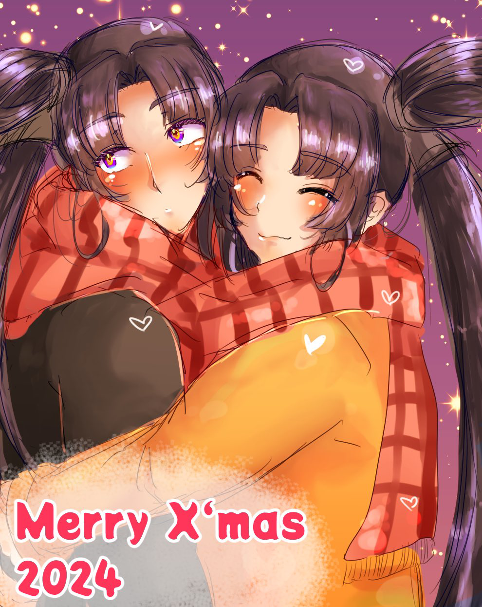 2024 2girls black_hair black_sweater blush charmyamber closed_eyes closed_mouth dual_persona fate/grand_order fate_(series) flustered heart highres hug light_particles long_hair looking_to_the_side merry_christmas multicolored_eyes multiple_girls red_scarf scarf selfcest side_ponytail sparkle sweater taira_no_kagekiyo_(fate) ushiwakamaru_(fate) yellow_sweater yuri