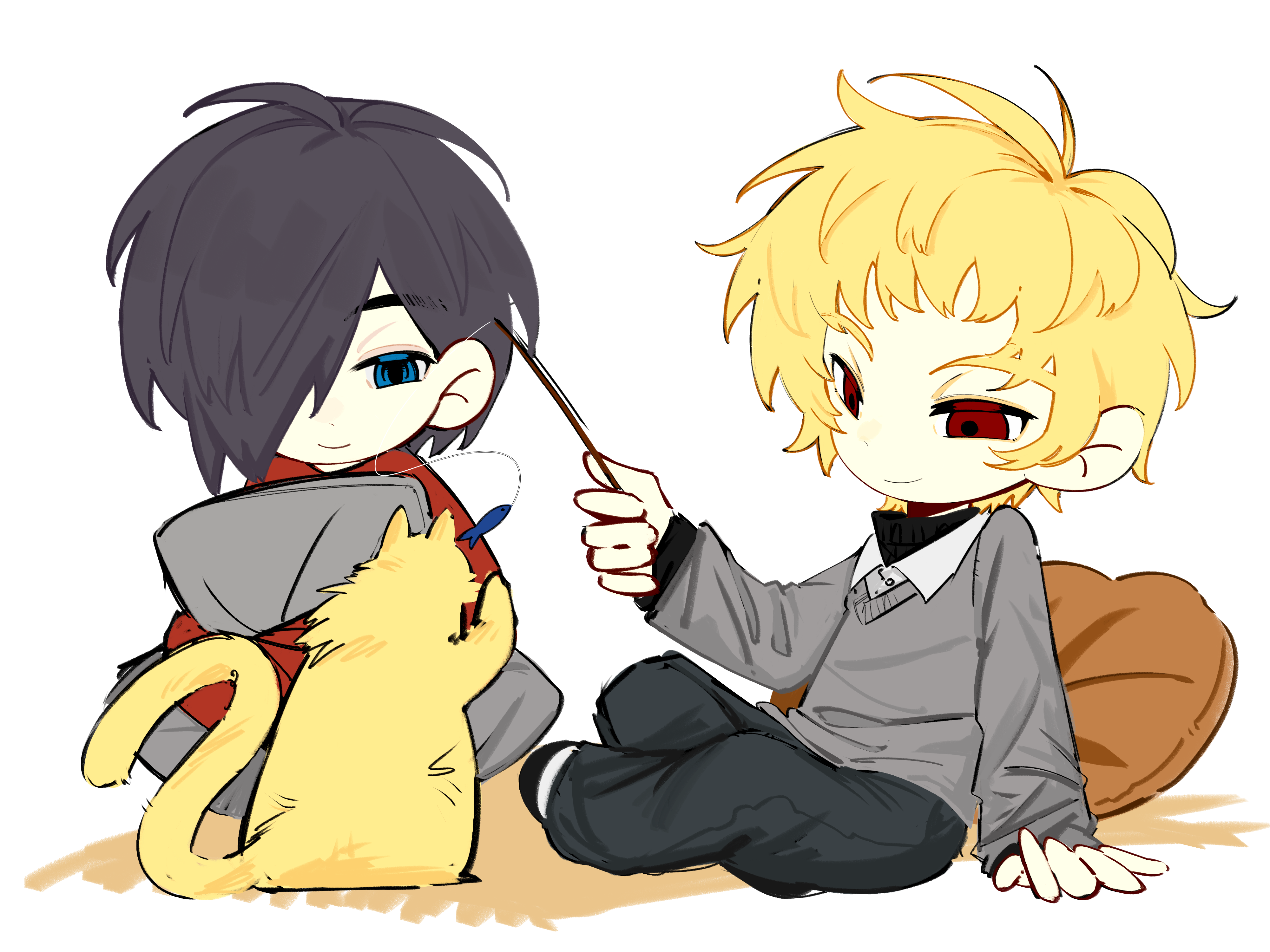2boys absurdres aiba_ibuki alternate_costume atou_haruki black_hair black_pants black_shoes black_sweater blonde_hair blue_eyes cat cat_teaser chikana. chinese_commentary closed_mouth collared_shirt commentary_request deformed grey_pants grey_sweater hair_over_one_eye highres holding holding_cat_teaser holding_pillow long_sleeves male_focus multiple_boys pants pillow red_eyes red_shirt saibou_shinkyoku shirt shoes short_hair sitting smile sweater uri_(saibou_shinkyoku) white_shirt yellow_cat