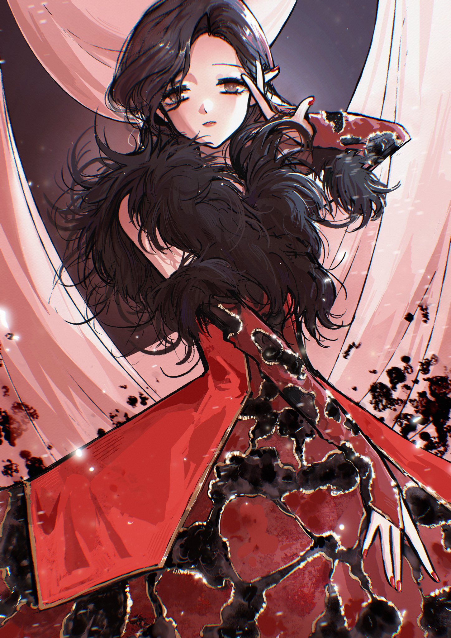 1girl black_hair brown_eyes chromatic_aberration closed_mouth commentary_request cowboy_shot curtains detached_sleeves dress fur-trimmed_dress fur_trim highres long_hair looking_at_viewer makeup mascara nakamori_akina okik2207 real_life red_dress red_nails solo splatter