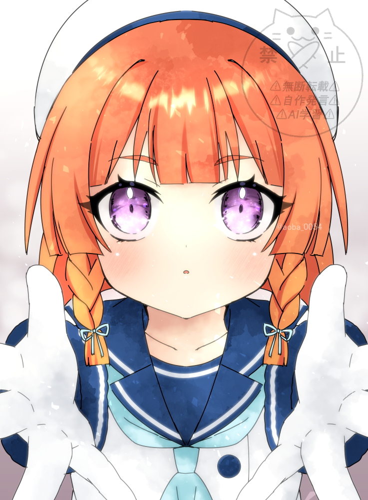 1girl blue_neckerchief blue_sailor_collar bob_cut braid etorofu_(kancolle) gloves hat imminent_hug kantai_collection long_sleeves neckerchief oyu_(aoba_0054) purple_eyes red_hair sailor_collar sailor_hat school_uniform serafuku short_hair side_braids solo twin_braids watermark white_gloves white_hat