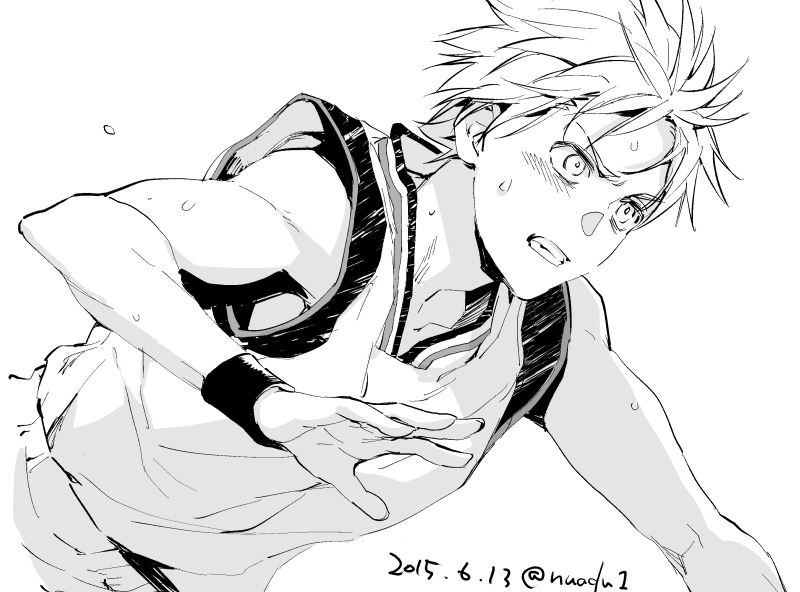 1boy arm_up armband bare_shoulders basketball_jersey basketball_uniform clenched_teeth dated dutch_angle greyscale kuroko_no_basuke kuroko_tetsuya looking_ahead male_focus monochrome playing_sports simple_background sleeveless sportswear sweat sweatdrop teeth torisu tumblr_username v-neck white_background