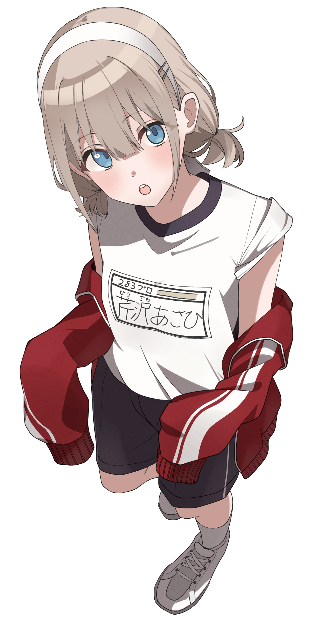 1girl :o black_shorts blush full_body gym_shirt gym_uniform hairband highres idolmaster idolmaster_shiny_colors jacket jacket_partially_removed looking_at_viewer name_tag nqmles red_jacket serizawa_asahi shirt shoes short_sleeves short_twintails shorts simple_background sleeves_past_fingers sleeves_past_wrists sneakers solo track_jacket twintails white_background white_hairband