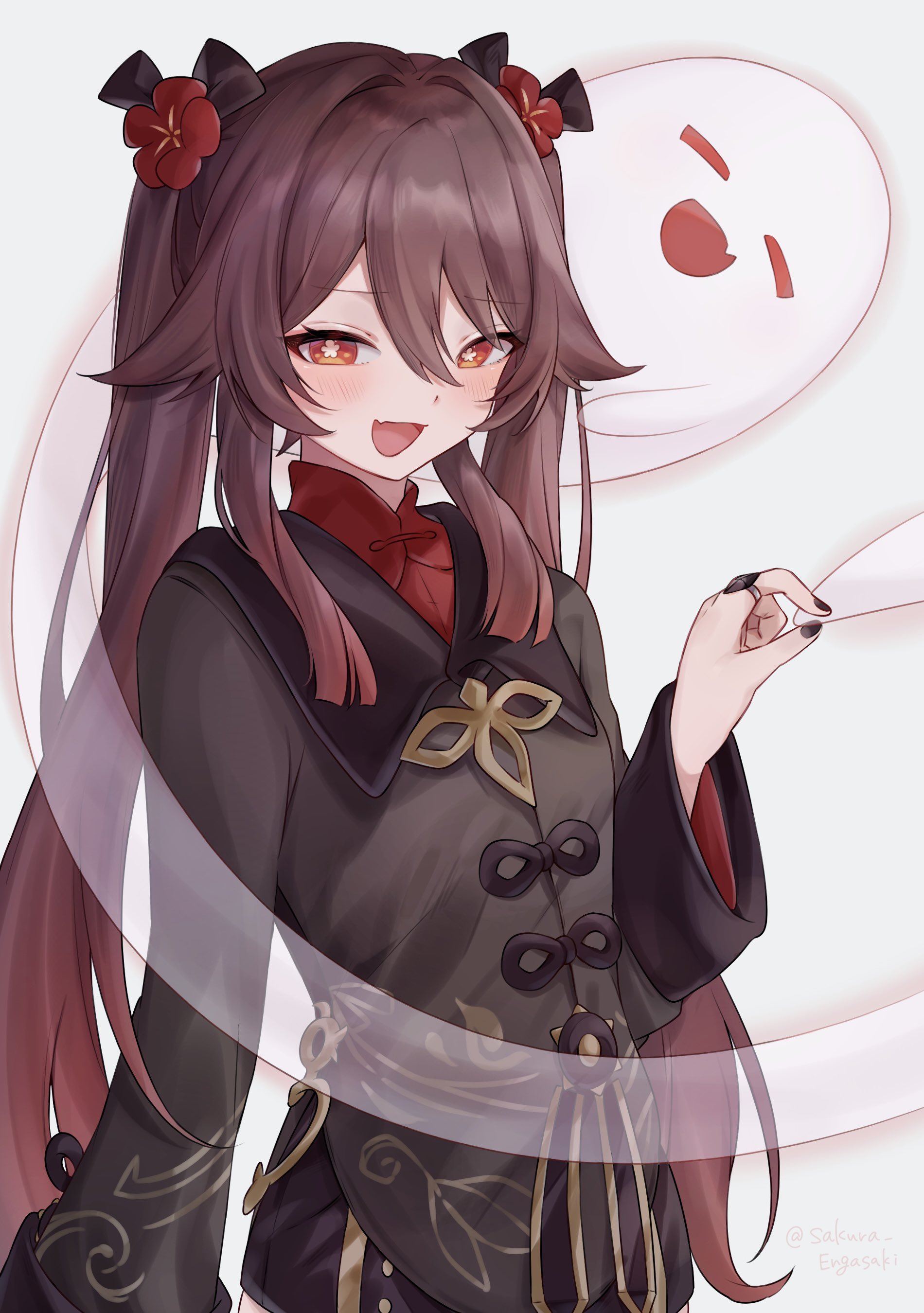 1girl absurdres black_nails boo_tao_(genshin_impact) brown_hair chinese_clothes collared_coat engasaki_sakura fang flower-shaped_pupils genshin_impact ghost half-closed_eyes hat_tassel highres hu_tao_(genshin_impact) jewelry long_hair looking_at_viewer mesugaki multiple_rings ring simple_background skin_fang solo symbol-shaped_pupils tailcoat twintails very_long_hair white_background