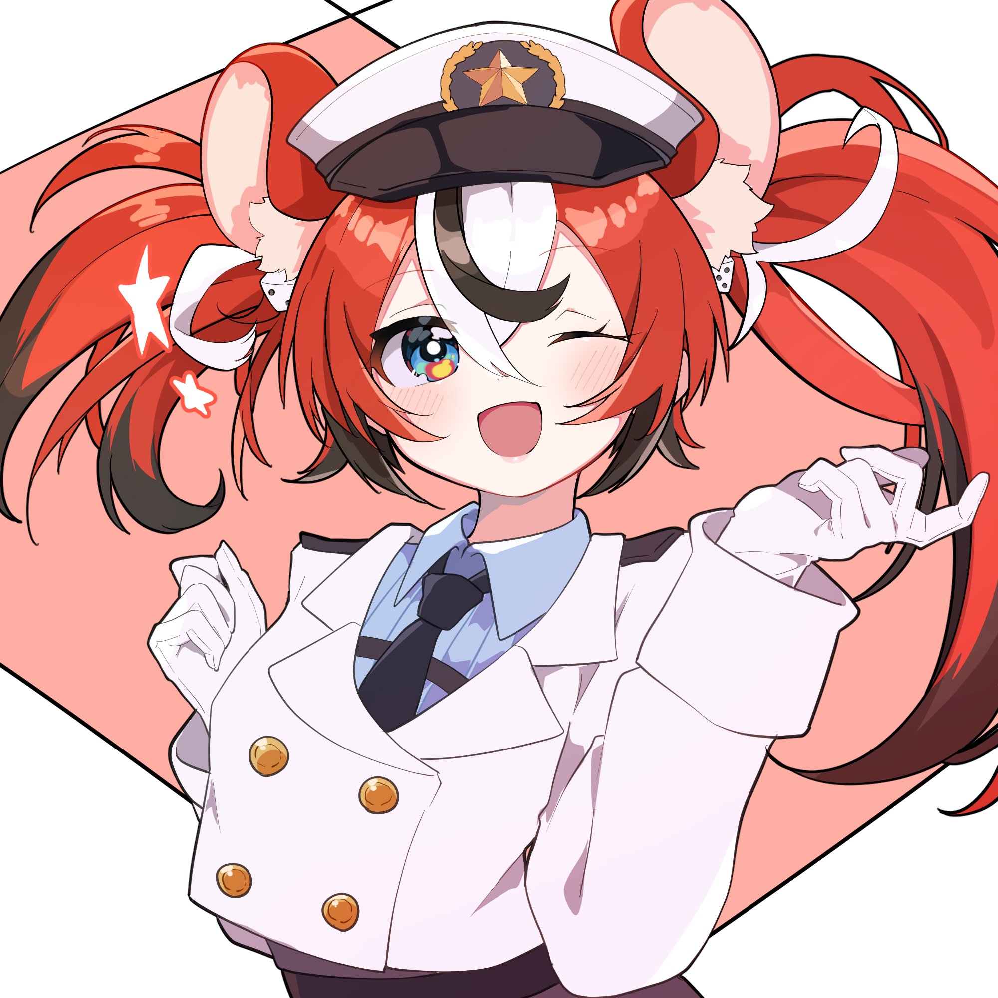 1girl ;d animal_ear_fluff animal_ears black_hair black_necktie blue_eyes blue_shirt border breasts collared_shirt commentary cosplay cropped_jacket dice_hair_ornament dress_shirt gloves hair_between_eyes hair_ornament hakos_baelz hat highres hololive hololive_english jacket kam_tuki long_hair long_sleeves looking_at_viewer medium_breasts mouse_ears mouse_girl multicolored_hair necktie official_alternate_costume one_eye_closed oozora_subaru oozora_subaru_(cosplay) oozora_subaru_(police) open_mouth outside_border pink_background police police_hat police_uniform policewoman red_hair ribbed_shirt shirt simple_background smile solo star_(symbol) streaked_hair twintails upper_body virtual_youtuber white_border white_gloves white_hair white_hat white_jacket