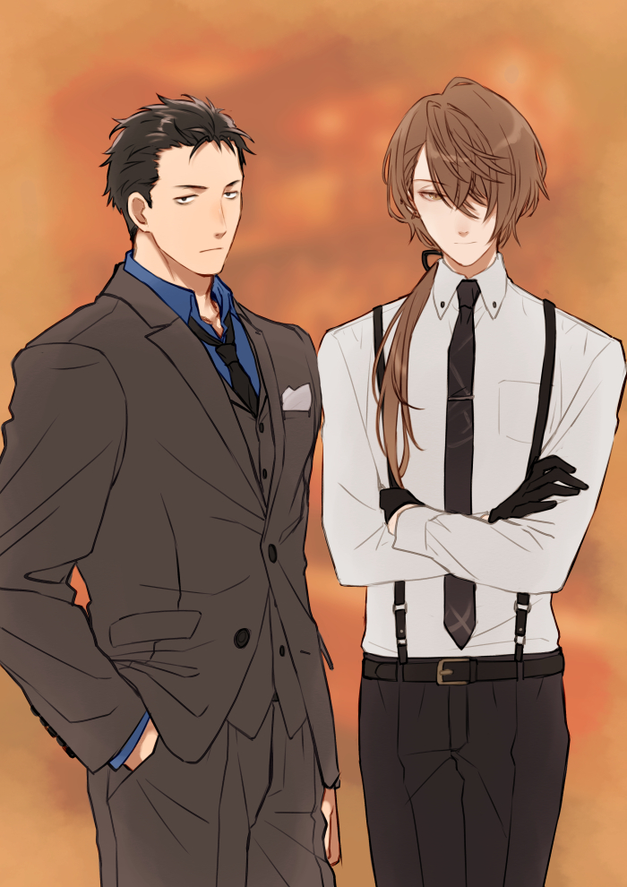 2boys belt belt_buckle black_belt black_eyes black_gloves black_hair black_necktie black_pants black_ribbon blue_shirt breast_pocket brown_background brown_eyes brown_hair brown_jacket brown_pants brown_vest buckle buttons closed_mouth collared_shirt commentary_request cowboy_shot crossed_arms crossed_bangs expressionless forehead gloves hair_between_eyes hair_over_one_eye hair_over_shoulder hair_slicked_back hand_in_pocket jacket kagami_hayato lapels long_hair long_sleeves looking_at_viewer low_ponytail male_focus multiple_boys necktie nijisanji one_eye_covered pants parted_bangs pocket pocket_square ponytail ribbon shirt short_hair standing succo_gura suspenders tie_clip very_short_hair vest virtual_youtuber white_shirt wing_collar yashiro_kizuku
