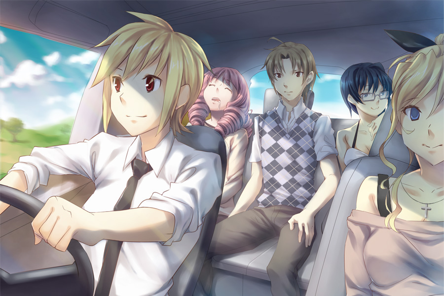 1boy 4girls :3 ahoge alternate_costume androgynous argyle_clothes argyle_sweater_vest artist_request black_bow black_necktie blonde_hair blue_eyes blue_hair blue_sky bow brown_eyes brown_hair brown_pants brown_shirt car_interior casual closed_mouth cloud collared_shirt cousins cross cross_necklace day drill_hair driving drooling game_cg glasses grey-framed_eyewear hair_bow hakamichi_shizune hand_on_own_leg jewelry katawa_shoujo long_hair mikado_shiina multiple_girls nakai_hisao necklace necktie non-web_source official_alternate_costume official_art open_mouth pants pink_hair red_eyes reverse_trap saliva satou_akira satou_lilly shirt short_hair siblings sisters sitting sky sleeping sleeping_upright smile smug sweater_vest teeth tree upper_teeth_only very_short_hair white_shirt
