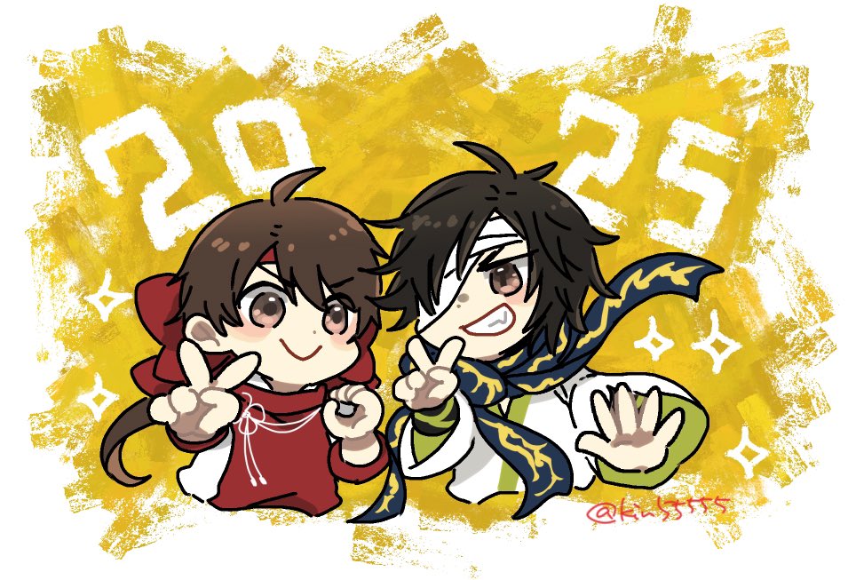 2025 2boys aged_down ahoge bandage_over_one_eye bow brown_eyes brown_hair chibi chibi_only cropped_torso date_masamune_(sengoku_basara) eishi2003 fang grin hair_bow headband long_hair male_focus multiple_boys official_alternate_costume ponytail red_bow red_headband sanada_yukimura_(sengoku_basara) sengoku_basara short_hair smile twitter_username v