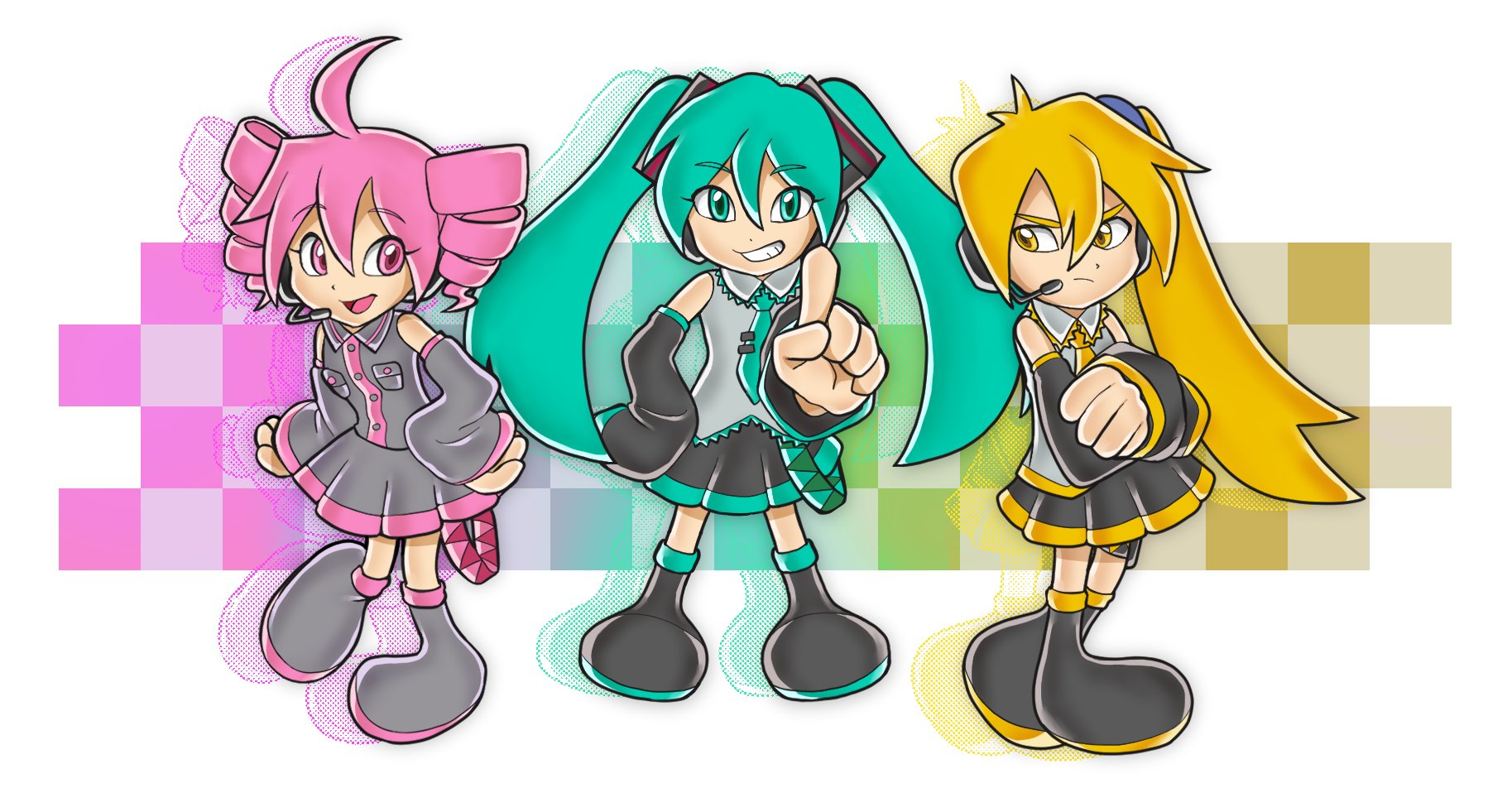 3girls akita_neru drill_hair hatsune_miku highres kasane_teto kasane_teto_(utau) litochra multiple_girls parody side_ponytail skirt smile sonic_(series) style_parody toon_(style) triple_baka_(vocaloid) twin_drills twintails uekawa_yuji_(style) utau vocaloid
