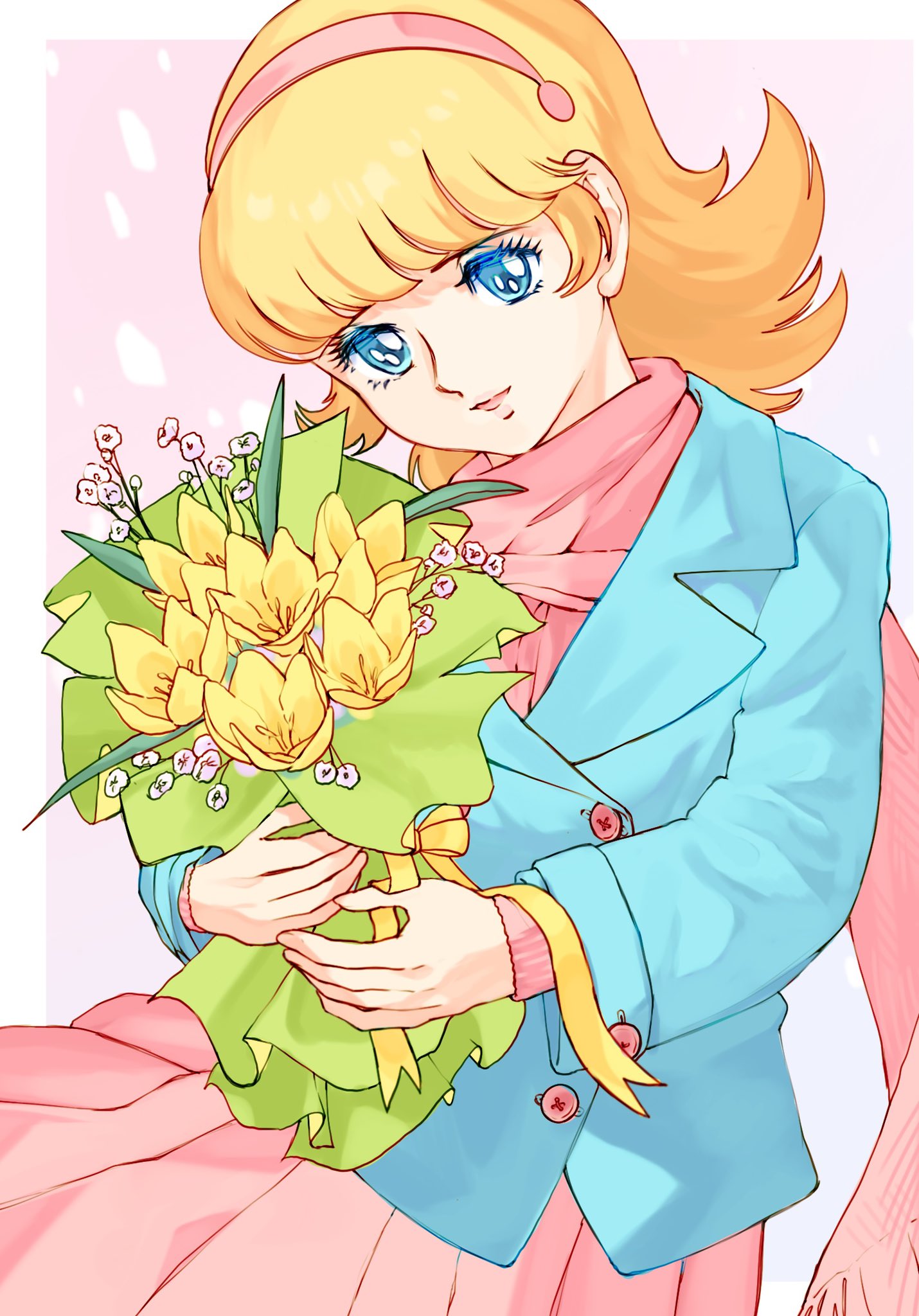 1girl blonde_hair blue_eyes coat cyborg cyborg_009 dress flower francoise_arnoul hairband highres holding looking_at_viewer open_mouth scarf short_hair simple_background smile solo upper_body yanaka_6009
