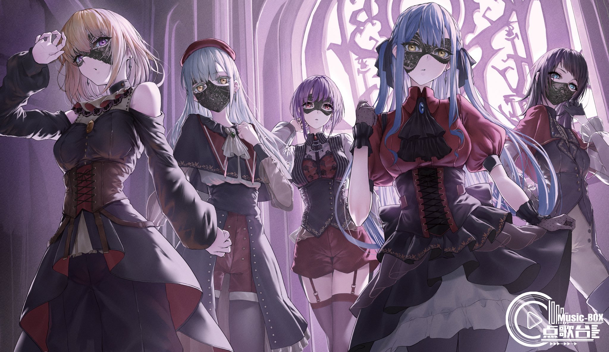 5girls akiaki_aki amoris_(bang_dream!) ascot ave_mujica_(bang_dream!) bang_dream! bang_dream!_it's_mygo!!!!! bead_necklace beads beret black_ascot black_capelet black_corset black_dress black_gloves black_hair black_mask black_pants black_pantyhose black_ribbon black_skirt black_vest blonde_hair blue_eyes blue_hair braid breasts brooch brown_corset capelet clothing_cutout collared_shirt corset doloris_(bang_dream!) dress garter_straps gloves green_hair hair_between_eyes hair_ribbon hand_up hat highres holding_own_dress jewelry long_hair long_sleeves looking_at_viewer mask masquerade_mask medium_breasts medium_hair misumi_uika mortis_(bang_dream!) mortis_(costume)_(bang_dream!) mouth_mask multiple_girls necklace oblivionis_(bang_dream!) pants pantyhose pantyhose_under_shorts parted_lips pink_eyes puffy_short_sleeves puffy_sleeves purple_eyes purple_hair red_capelet red_hat red_shirt red_shorts red_thighhighs ribbon shirt short_sleeves shorts shoulder_cutout showgirl_skirt skirt thighhighs timoris_(bang_dream!) togawa_sakiko two-tone_pants vest wakaba_mutsumi white_ascot white_pants yahata_umiri yellow_eyes yuutenji_nyamu