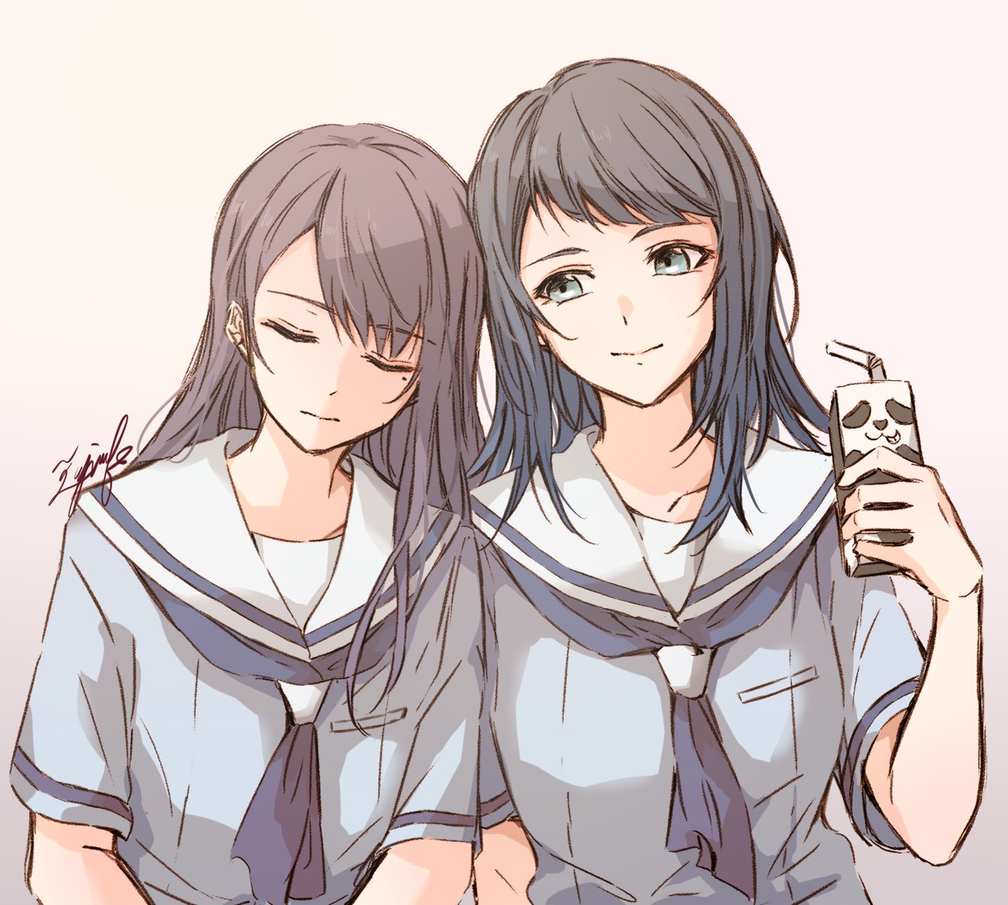 2girls aiiro_bokujuu bang_dream! bang_dream!_it's_mygo!!!!! black_hair blue_eyes blue_neckerchief blue_shirt brown_hair closed_eyes commentary_request grey_background hanasakigawa_school_uniform highres holding_carton long_hair medium_hair mole mole_under_eye multiple_girls neckerchief sailor_collar school_uniform serafuku shiina_taki shirt short_sleeves signature sleeping white_sailor_collar yahata_umiri