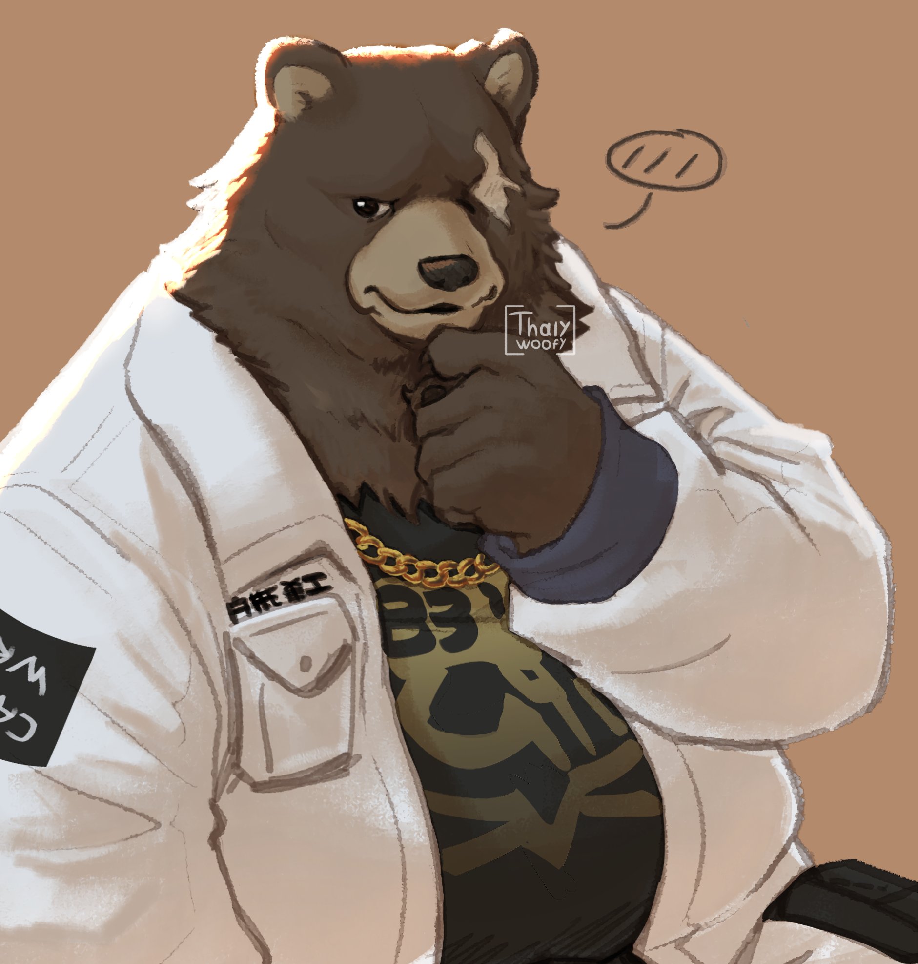 1boy animal_ears artist_logo artist_name bear_boy bear_ears ben_bigger black_tank_top brown_fur chain chain_necklace claws furry furry_male hand_on_own_chin highres jacket jewelry logo looking_to_the_side male_focus necklace open_mouth pawpads scar scar_across_eye scar_on_face speech_bubble spoken_blush tank_top thalywoofy white_jacket zenless_zone_zero
